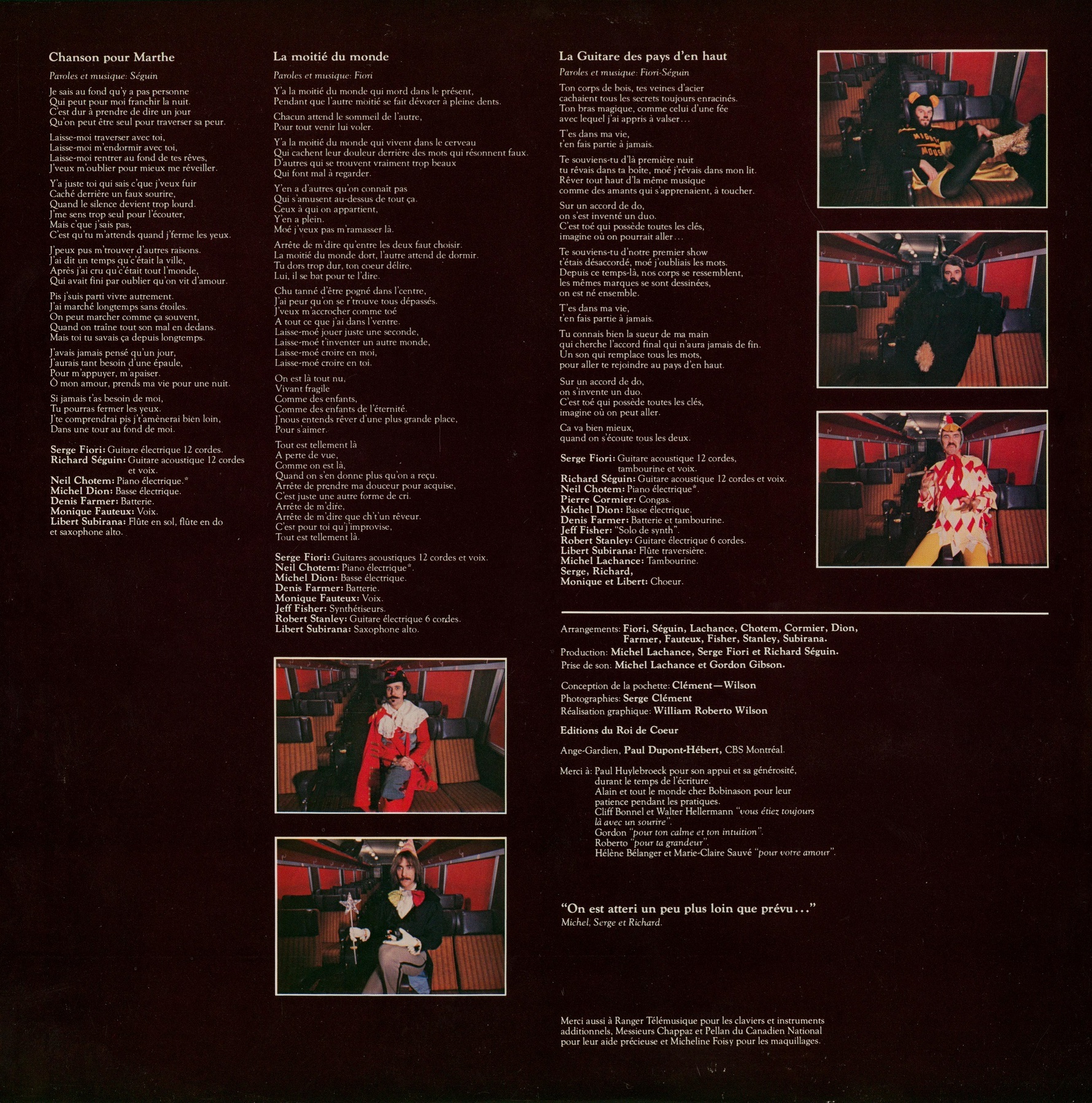 Released in 1978 on CBS Records Canada, the album masterfully balanced the lush, layered instrumentation characteristic of Harmonium’s late period with the accessibility and lyrical depth of Séguin’s songwriting. Alternating between co-written pieces and individual compositions, the record offered a perfect synthesis of their styles. Songs like the soaring title track, the playful Viens danser, and the intimate Chanson pour Marthe captured an emotional and musical range rarely achieved in popular music. The arrangements, enriched by the talents of Harmonium veterans Neil Chotem, Libert Subirana, Denis Farmer, and others, gave the album a polished, organic sound that remains timeless.