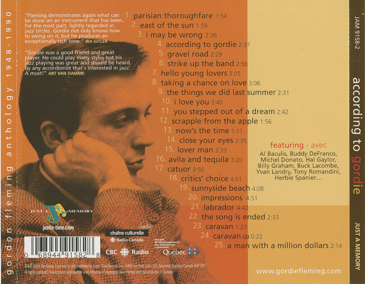 Gordie Fleming, one of Canada’s finest musicians, was a native of Winnipeg. He performed on the vaudeville Army circuit in the 30’s and 40’s, and later, in Montreal in the ‘50’s, opened for such visiting artists as Charlie Parker, the King Cole Trio, Lena Horne, Dizzy Gillespie, and Cab Calloway. He was active in the vibrant jazz and studio worlds of both Toronto and Montreal from 1949 to 1990, and he died in 2002. Over the course of those decades, this virtuoso accordionist evolved in the company of some of music’s most respected and illustrious jazz and popular music personalities, from Edith Piaf to Hank Snow. He performed with most of the great Canadians in jazz at one time or another including Oscar Peterson and Maynard Ferguson. The material on this recording, part of Justin Time’s acclaimed Just A Memory series, were culled mostly from CBC radio shows, and happily, several broadcasts that featured Gordie Fleming have survived. This delightful album features a historical performance of Gordie Fleming and company opening for Charlie Parker as part of the poll-winning group The Canadian All Stars, at Montreal’s Chez Paree on Feb. 7, 1953. Three cuts from the All-Stars’ Discovery LP (Savoy) are included, as well as one from Waterbed, the Buddy DeFranco recording that featured Gordie Fleming on the Choice/Candid label. The compilation was compiled by a JUNO-nominated producer Heidi Fleming, Gordie’s daughter.
