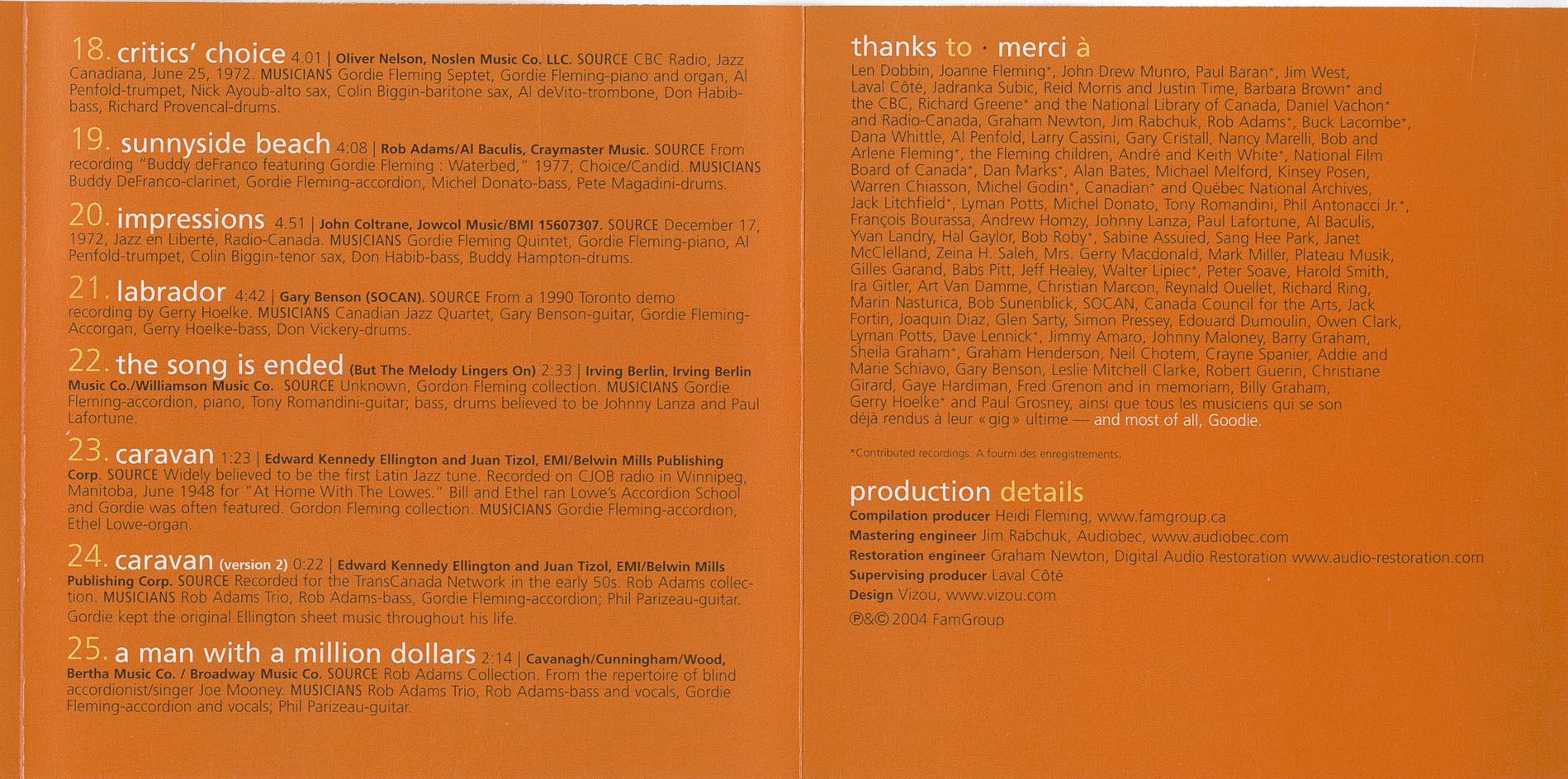 Thanks / Merci – Len Dobbin, Joanne Fleming, John Drew Munro, Paul Baran*, Jim West, Laval Côté, Jadranka Subic, Reid Morris and Justin Time, Barbara Brown* & the CBC, Richard Greene* and the National Library of Canada, Daniel Vachon* & Radio Canada, Graham Newton, Jim Rabchuk, Rob Adams*, Buck Lacombe*, Dana Whittle, Al Penfold, Larry Cassini, Gary Cristall, Nancy Marelli, Bob & Arlene Fleming*, the Fleming children, André & Keith White*, National Film Board of Canada*, Dan Marks*, Alan Bates, Michael Melford, Kinsey Posen, Warren Chiasson, Michel Godin*, Canadian* and Quebec National Archives, Jack Litchfield*, Lyman Potts, Michel Donato, Tony Romandini, Phil Antonaci Jr.*, François Bourassa, Andrew Homzy, Johnny Lanza, Paul Lafortune, Al Baculis, Yvan Landry, Hal Gaylor, Bob Roby*, Sabine Assuied, Sang Hee Park, Janet McClelland, Zeina H. Saleh, Mrs. Gerry MacDonald, Mark Miller, Plateau Musik, Gilles Garand, Babs Pitt, Jeff Healey, Walter Lipiec*, Peter Soave, Harold Smith, Ira Gitler, Art VanDamme, Christian Marcon, Reynald Ouellet, Richard Ring, Marin Nasturica, Bob Sunenblick, SOCAN, Canada Council for the Arts, Jack Fortin, Joaquin Diaz, Glen Sarty, Simon Pressey, Edouard Dumoulin, Owen Clark, Lyman Potts, Dave Lennick*, Jimmy Amaro, Johnny Maloney, Barry Graham, Sheila Graham*, Graham Henderson, Neil Chotem, Crayne Spanier, Addie & Marie Schiavo, Gary Benson, Leslie Mitchell Clarke, Robert Guérin, Christiane Girard, Gaye Hardiman, Fred Grenon and in memoriam, Billy Graham, Gerry Hoelke* and Paul Grosney, ainsi que tous les musiciens qui se son déjà rendus à leur ”gig” ultime- and most of all, Gordie.