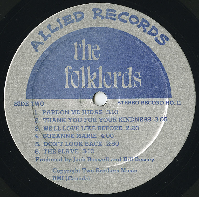 The Folklords toured, "but didn't get much support from Allied". They appeared on a few TV shows, "but it wasn't an easy time in Canada in those days", Tom writes. He continued "We split the group in late '69 and that is when I started a solo career before forming some different groups of which I will tell you more about later. The response The Folklords have had over the past 10 years is just astounding I get mail from around the world and quite a bit of airplay on college radio"