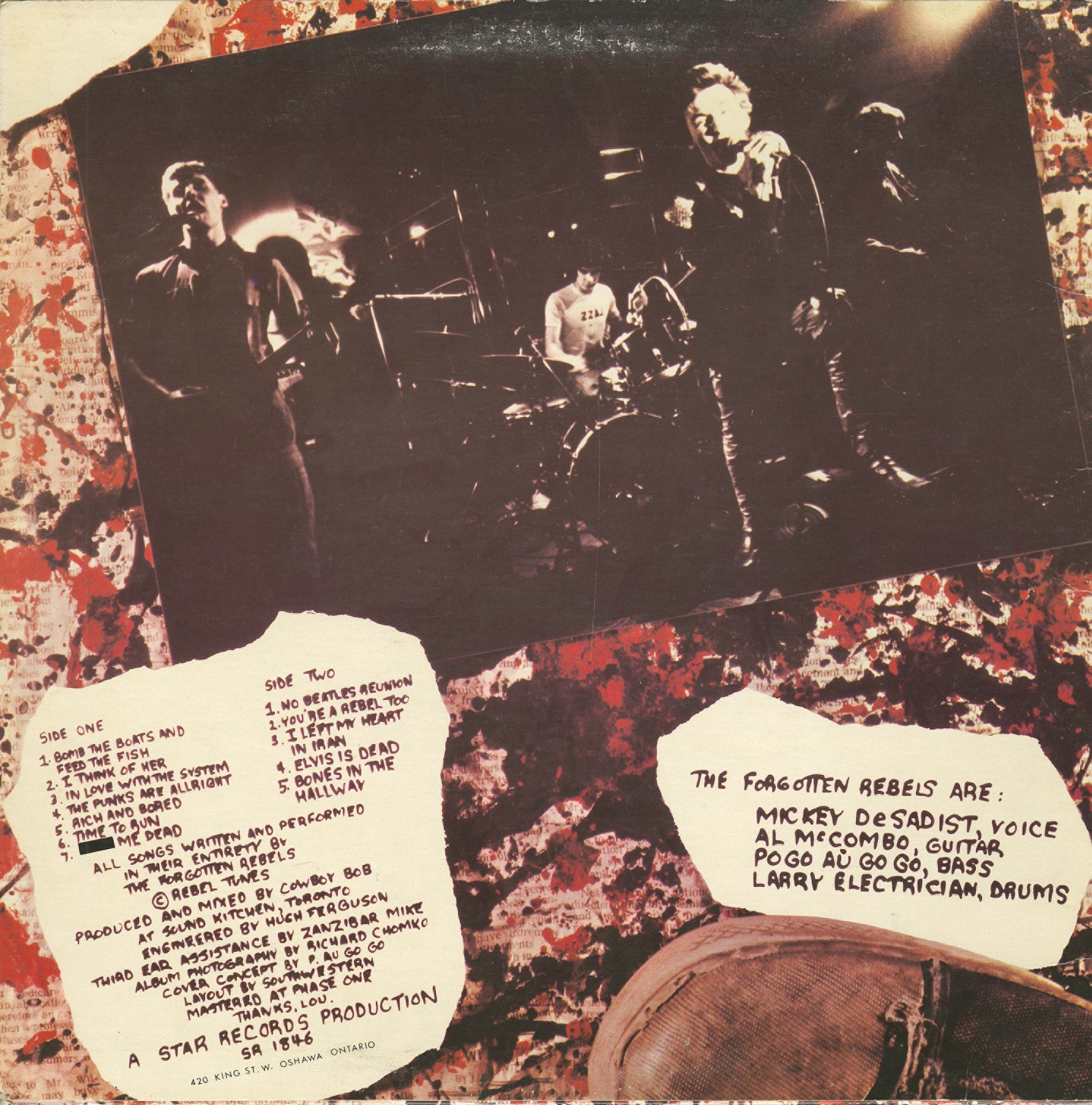 April 7, 1980: 'In Love with the System' LP cover design finished. Concept by myself and Richard Chomko. Tuesday April 29, 1980 - I am informed by Brian Simpkins, manager of Golden Records (record plant) that 3 of Toronto's printing houses will not, I repeat will NOT print The Forgotten Rebels album cover or insert because of profanity. I quote Luis Bunuel to myself: 'In a world as badly made as this one, there is only one road - rebellion.' Despite all of our efforts to convince the printers to do the job - we are 'forced' to black out the title of one of the songs on the back cover if we want the album out on time. We are working on getting a Ramones show for the area and having the Rebels open up. Wednesday, May 14, 1980 - The Forgotten Rebel 'In Love with the System' LP is released on Star Records - The Label with No Choice. Wednesday, May 21, 1980 - The Ramones come to Star Records, Hamilton for an autograph session. That night The Forgotten Rebels open up for them in Burlington. The agreement was The Rebels could open for the Ramones if they did NOT play 'I Wanna be a Nazi'. Of course, they did. Still in search of the perfect haircut. June, 1980 - I spend assuring the entire civilized world that The Forgotten Rebels are not, I repeat NOT a neo-nazi organization bent on world conquest. It starts with a gentleman who attends the Ramones/Rebels show who happens to have lost his whole family in the holocaust. He is so outrages by 'Nazis' that he call the office of the Attorney-General who proceeds to call the Burlington Police. On Wednesday June 18, I meet with Sgt Sullivan and detectives in Burlington who have an actual copy of 'In Love with the System' with insert. I assure them that these 'kids' are 'harmless' (are they really?) And that they are simply total knee-jerk reactionaries who will do anything to shock you - bur there's nothing much behind it. This seems to satisfy the police and the Attorney General BUT NOT, I REPEAT NOT CFNY. (Believe it or not - that bastion of 'alternative' music was the most offended party. Mainly because of 'Third Homosexual Murder' on the EP.) Backtracking a little - on June 10, 1980 - I had to meet with David Marsden and other staff of CFNY to assure them that The Forgotten Rebels will really not shoot you if you're gay - but that song was merely their way of 'reporting'. I still doubted we were going to get any airplay - and we didn't. It seems everybody misses that strategic verse in Mickey's song 'Nazis' where he says: 'You'd have to be quite an idiot...to believe in this mess.' (Source: Bob Bryden's website)