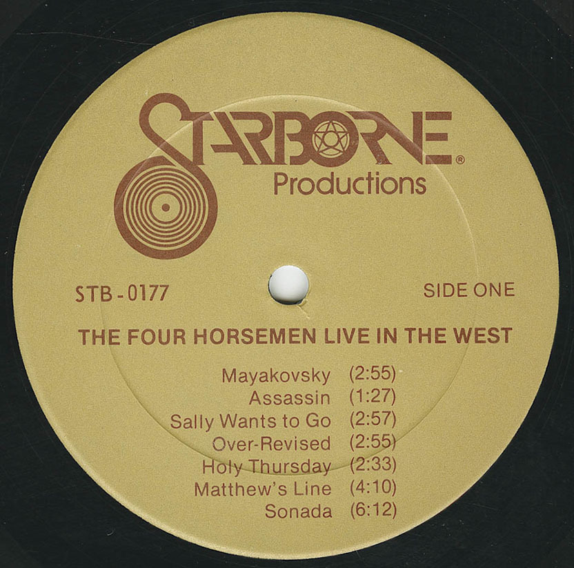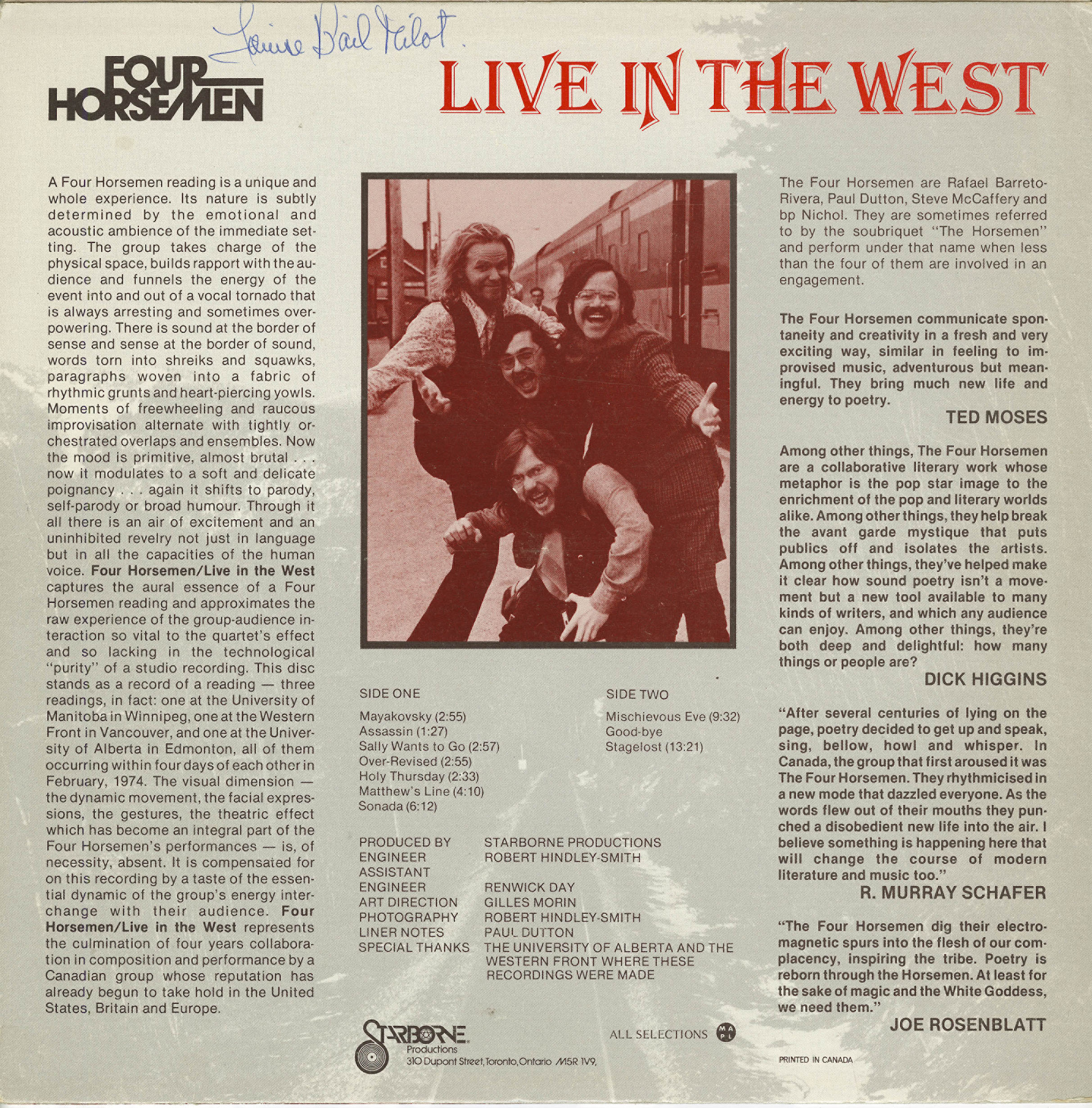A Four Horsemen reading is a unique and whole experience. Its nature is subtly determined by the emotional and acoustic ambience of the immediate setting. The group takes charge of the physical space, builds rapport with the audience and funnels the energy of the event into and out of a vocal tornado that is always arresting and sometimes overpowering. There is sound at the border of sense and sense at the border of sound, words torn into shreiks and squawks, paragraphs woven into a fabric of rhythmic grunts and heart-piercing yowls. Moments of freewheeling and raucous improvisation alternate with tightly orchestrated overlaps and ensembles. Now the mood is primitive, almost brutal ... now it modulates to a soft and delicate poignancy ... again it shifts to parody, self-parody or broad humour. Through it all there is an air of excitement and an uninhibited revelry not just in language but in all the capacities of the human voice. Four Horsemen/Live in the West captures the aural essence of a Four Horsemen reading and approximates the raw experience of the group-audience interaction so vital to the quartet's effect and so lacking in the technological "purity" of a studio recording. This disc stands as a record of a reading - three readings, in fact: one at the University of Manitoba in Winnipeg, one at the Western Front in Vancouver, and one at the University of Alberta in Edmonton, all of them occurring within fourdays of each other in February, 1974. The visual dimension the dynamic movement, the facial expressions, the gestures, the theatric effect which has become an integral part of the Four Horsemen's performances - is, of necessity, absent. It is compensated for on this recording by a taste of the essential dynamic of the group's energy interchange with their audience. Four Horsemen/Live in the West represents the culmination of four years collaboration in composition and performance by a Canadian group whose reputation has already begun to take hold in the United States, Britain, and Europe.