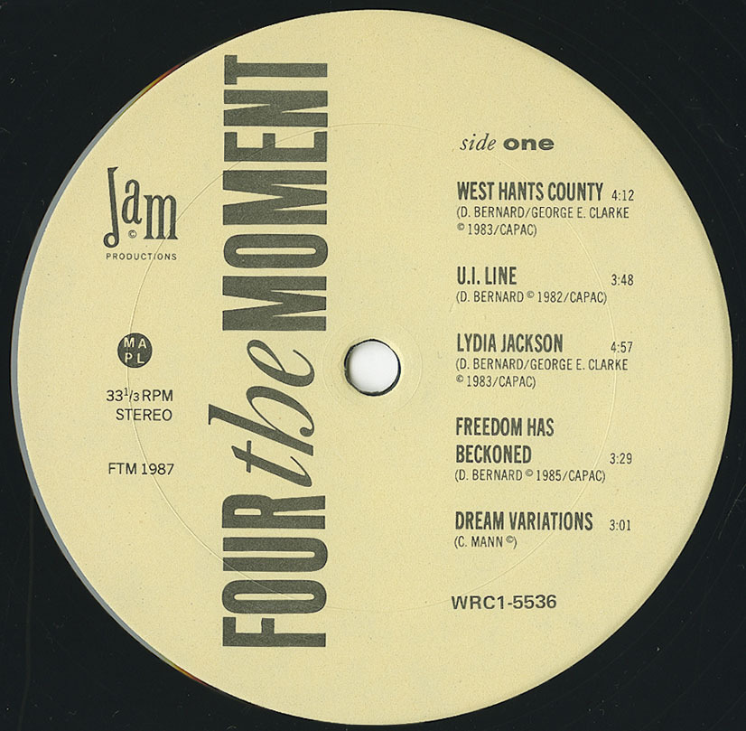 Its songs, many written by Delvina Bernard (some with lyrics by Halifax poet George Elliott Clarke), are of a political nature - eg, about Black history in Nova Scotia ('Africville,' 'West Hants County,' etc), women's struggles, and South Africa. Bringing the influence of R&B and reggae to what is at base a gospel format, Four the Moment has appeared at folk festivals, women's events and black culture celebrations across Canada, and performed at Expo 86, the Olympic Arts Festival (Calgary 1988), the Ottawa International Jazz Festival (1989) and Sound Symposium (St John's, Nfld, 1990). It has also been heard widely on CBC radio variety programs.