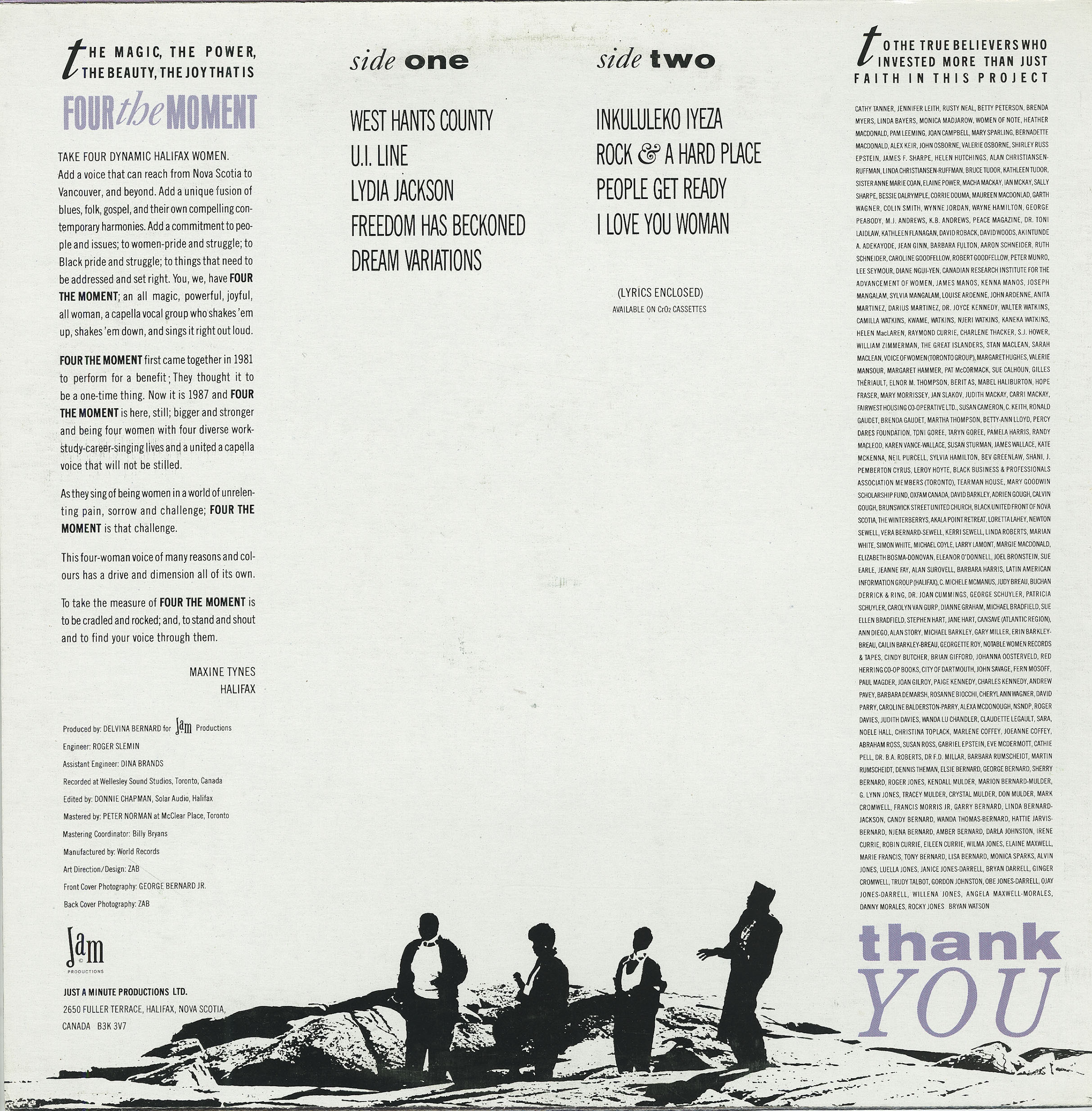 The four women made their debut at an anti-Ku Klux Klan rally in Halifax, where they sang 'Joanne Little' from the repertoire of the US a cappella quintet Sweet Honey in the Rock, on which Four the Moment was initially modelled. Personnel subsequently varied: the Bernard sisters have been constant; Barkley, who became the quartet's manager, was replaced by Andrea Currie, and Sparks was replaced in turn by Debby Jones and Anne Marie Woods.