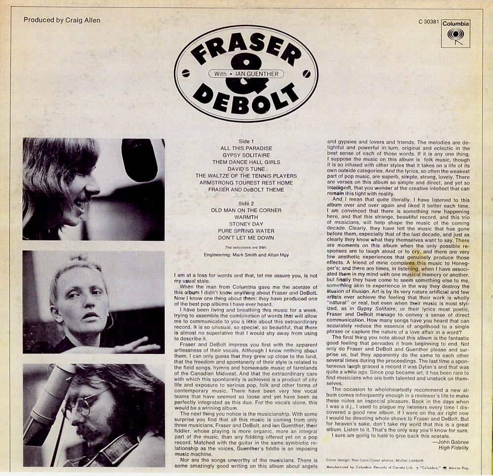 "One of the many sad secrets of the popular music business is the way this little gem languished in obscurity. It should have been heard by millions, but disappeared at the height of psychedelia. Two years later, the Band found an audience with haunting tales of bygone rustic North American life with their seminal, self-titled second album. Widespread acclaim eluded the earlier outing by this unheralded Canadian trio. The songs, most written independently by Daisy DeBolt or Allan Fraser, are poetic. DeBolt's slowly unfolding, album-opening "All This Paradise" is a marvel, introducing listeners right away to her commanding voice and the sinuous fiddle of Ian Guenther. The album was out of print for years, scratchy vinyl platters still treasured by a small but fervent number of fans."