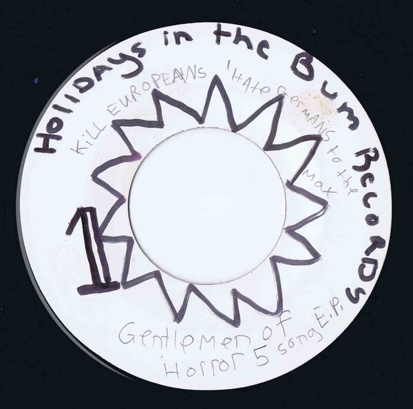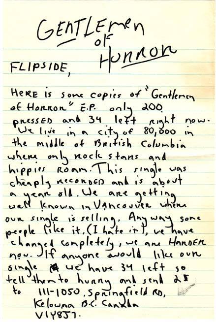 This was the only release by GOH. It was recorded in November of 1980 in Donny Walchuk's basement and released in January 1981. It was recorded for $60 in one evening, live to a reel to reel 4-track, with the vocals overdubbed. We pressed 200 copies (at Praise Records in Vancouver-a Christian pressing company!) with blank, white labels and hand drew on them with coloured felt markers, saving a $50 printing charge. Every label was unique; some had the songs titles, some had things like "Virgin Records" and anarchy symbols on them, one even had a very good likeness of Barney Rubble drawn by Tom.