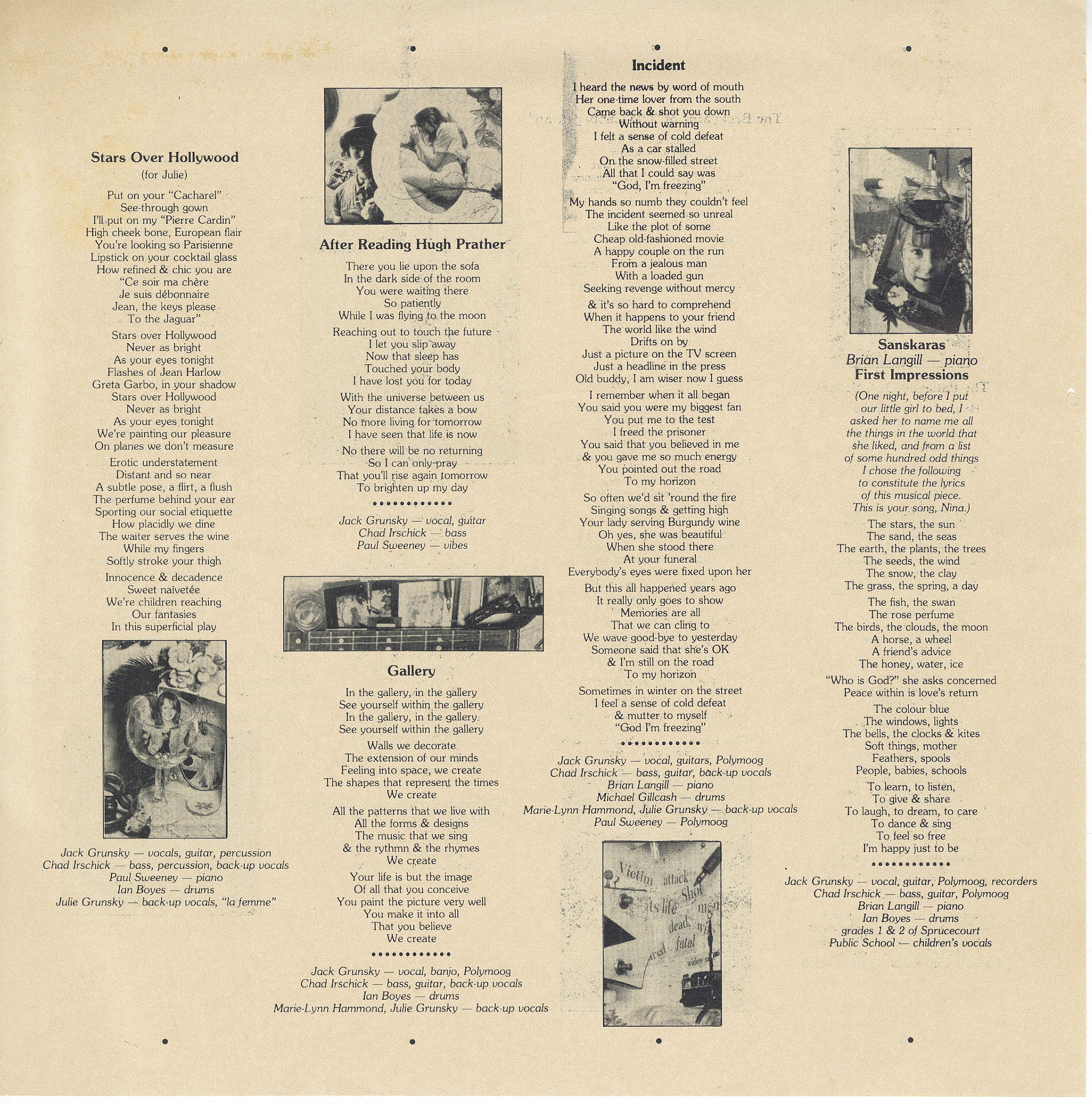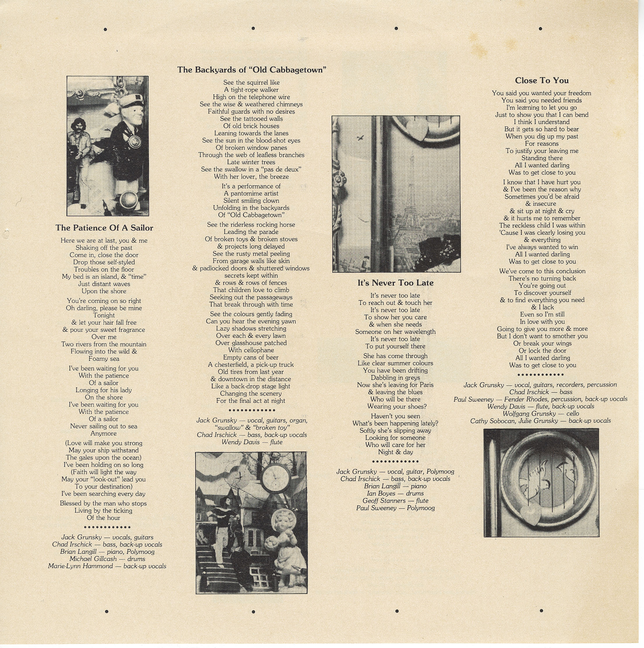 In 1974 Jack Grunsky moved with his family back to Canada where he connected with record producer Chad Irschick, and released an independent album titled, The Patience Of A Sailor.