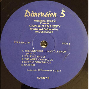 CAPTAIN ENTROPY (a participation journey for elementary and high-school people~-through the soul of space-ship earth--from principles of thermodynamics to folks like the American eagle) Created and totally performed by BRUCE HAACK." - from Original Liner Notes