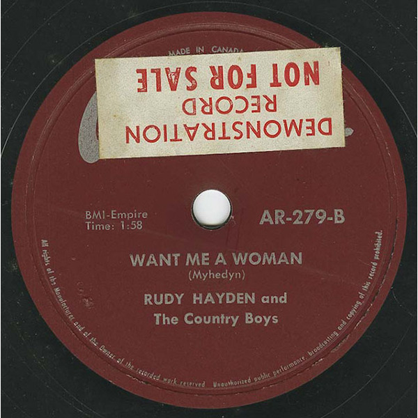 I - 1957 - Saw him in Aragon's Recording Studio cutting a song he penned "Want Me a Woman" and one that Rudy Derton wrote "Blue Steel". "Want Me a Woman" was well received in Europe. This song was included on a Netherland's label "Early Canadian Rockers". Rudy Hayden was the first Canadian artist to write and record a rockabilly tune, "Want Me a Woman" in Canada.