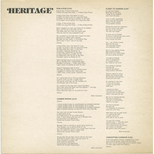 Rub-A-Rub-Dub is an album about Newfoundland with new and original songs about all parts of the island from St. John's to Port aux Basques. The album represents the progress made during the past year by Heritage, a unique combination of three medical students from Memorial University, Newfoundland - Willie Arsenault, Harold Crewe and Phil Simms. They came together by accident in February, 1974 in order to sing "Rub-A-Dub-Dub", Willie's entry in the Confederation Song Contest, held to celebrate Newfoundland's 25th anniversary of Confederation. The song captured the imagination of Newfoundlander's and encouraged the boys to continue singing and developing original Newfoundland music.
