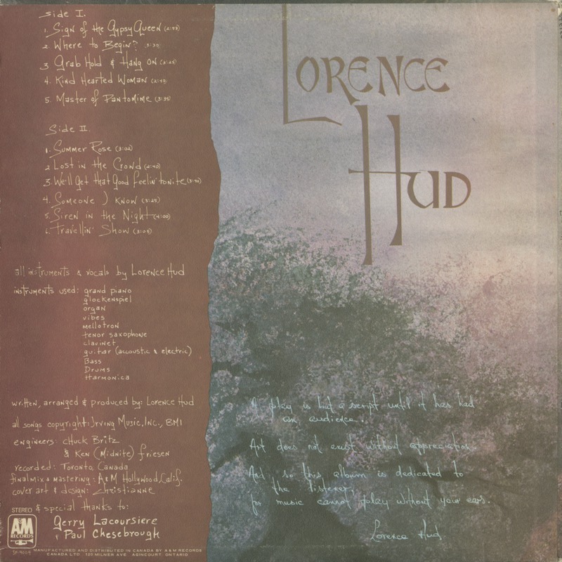 All instruments and vocals by Lorence Hud including grand piano, glockenspiel, organ, vibes, mellotron, tenor saxophone, clavinet, acoustic guitar, electric guitar, bass, drums, harmonica