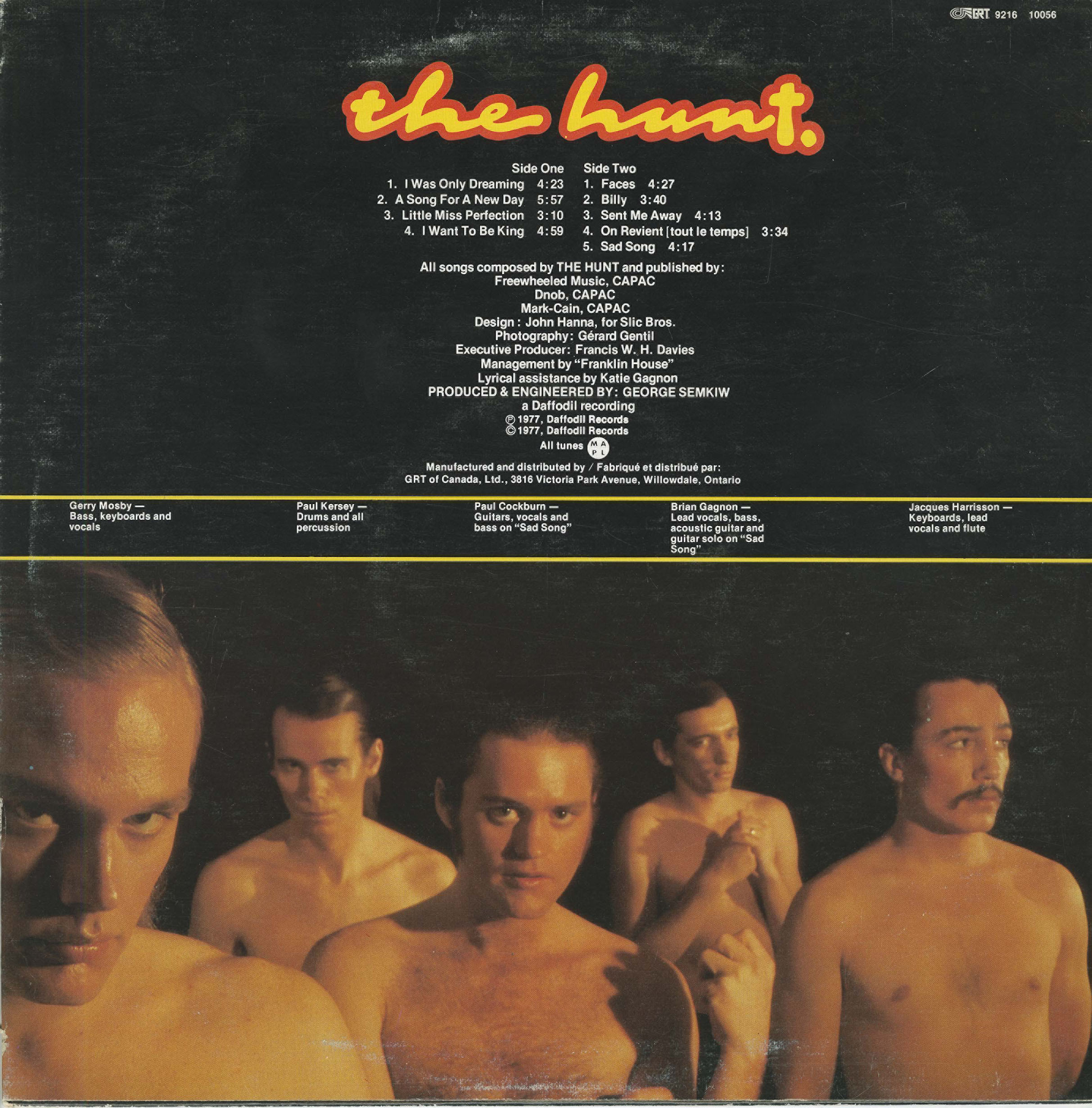 In 1977, after Dillinger broke up, guitarists Paul Dickinson and Paul Cockburn, drummer and percussionist Paul Kersey, keyboard player Jacques Harrison, keyboard player and bass guitarist Gerry Mosby, bass guitarist Carl Calvert, and guitarist and bass guitarist Brian Gagnon performed together as The Hunt. This project of the same name features similar tones that could be heard from the group previously, although they found a much more developed and mature sound under this new group structure.