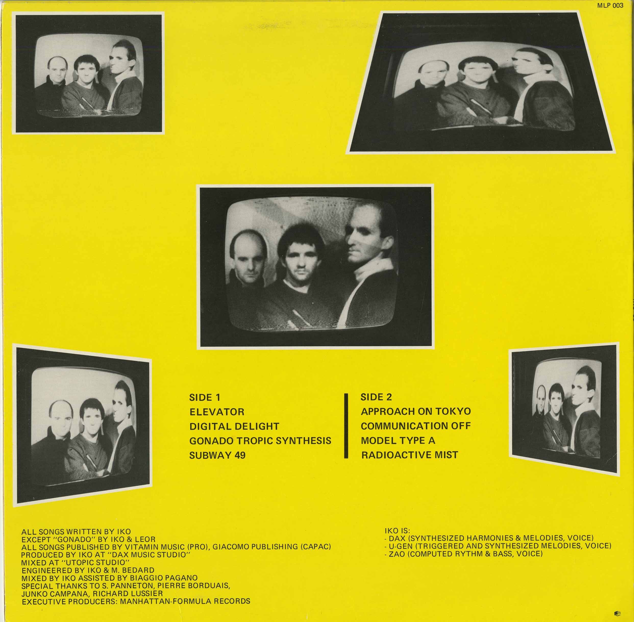 This coveted album by minimal synth aficionados around the globe has been out of print and very rare since it’s original release in 1982. Hailing from Montreal, Canada, IKO has always been shrouded in mystery. All 3 members come from an academic background (electroacoustic composition, etc), and they met at the University of Montreal in the music department. Taking from their collective influences of 60’s pop, prog and minimalist composers as well as early industrial, they played in a few early bands before solidifying the all-synth incarnation of IKO in it’s definitive lineup. The LP was originally released on Manhattan Formula. Other than Rational Youth, the Montreal synth scene was small, and the band broke up not too long after it’s release. Over the years, it has slowly achieved cult status of the highest order and now fetches inflated collector’s prices on the open market. It even prompted an unauthorized bootleg LP a few years ago (of much inferior sound quality). “Approach On Tokyo” sets the mood with it’s electro hooks and almost “Trans-Europe Express” synth parts. “Gonadotropic Synthesis” is an amazing slow and beautiful synthy melodic number which blurs the lines between love song and a lecture on hormonal interplay out of a medical textbook”. “Digital Delight” is a fast paced dance floor favorite with cyborg lyrics and catchy hooks.