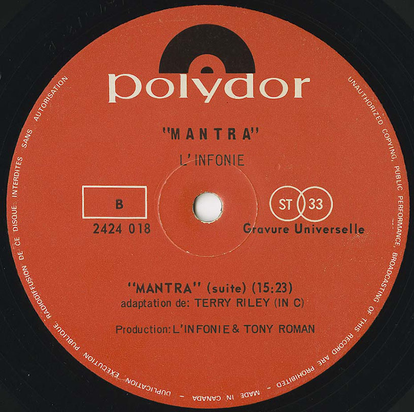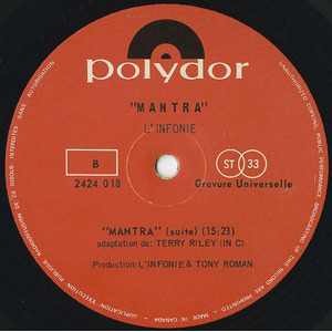 For it's second album, L'Infonie recorded Walter Boudreau's arrangement of Terry Riley's landmark piece for wind ensemble "In C," here re-titled "Mantra." Boudreau modified it in order to fit L'Infonie's possibilities, but he also added a rhythm section. Therefore, this is the grooviest version of "In C" ever recorded. The bass (electric) and drums support the piano's pulsation, while an assortment of percussion instruments are used to punctuate events as they happen in order to give the piece relief. Riley's score is made of 53 short events placed on a pulsation. Each player has to move from the first to the second to the third, etc., until he reaches number 53, but he can repeat each of them as many times as he wants. Therefore, the piece evolves through some kind of osmosis. This impression is very palpable in L'Infonie's interpretation. The studio they recorded in was using 30-minute tape reels, so the album fades out around number 48. In the liner notes, Boudreau announced the remaining part would be released on a future L'Infonie record, but that promise was never fulfilled.