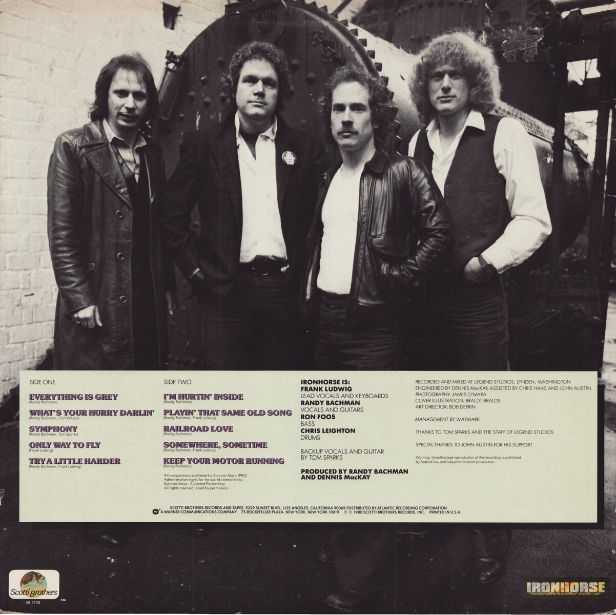 Ironhorse was a Canadian rock band formed in 1979 by Randy Bachman following his departure from Bachman-Turner Overdrive (BTO). Frustrated by the creative limitations he faced on Freeways and looking for a new musical outlet, Bachman returned to the West Coast and began writing new material while producing albums for artists like Trooper. Teaming up with Washington State guitarist/vocalist Tom Sparks, bassist John Pierce, and drummer Mike Baird, the new group signed a deal with Scotti Brothers Records and entered Studio 55 in Hollywood to record their self-titled debut album.