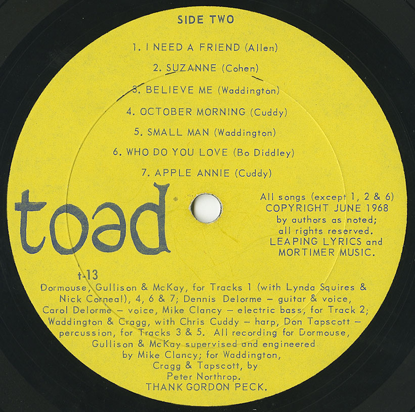 All recordings for Waddington, Cragg, Tapscott and Cuddy engineered by Peter Northrop at the Trent University Language Lab in Peterborough, Ontario Canada.