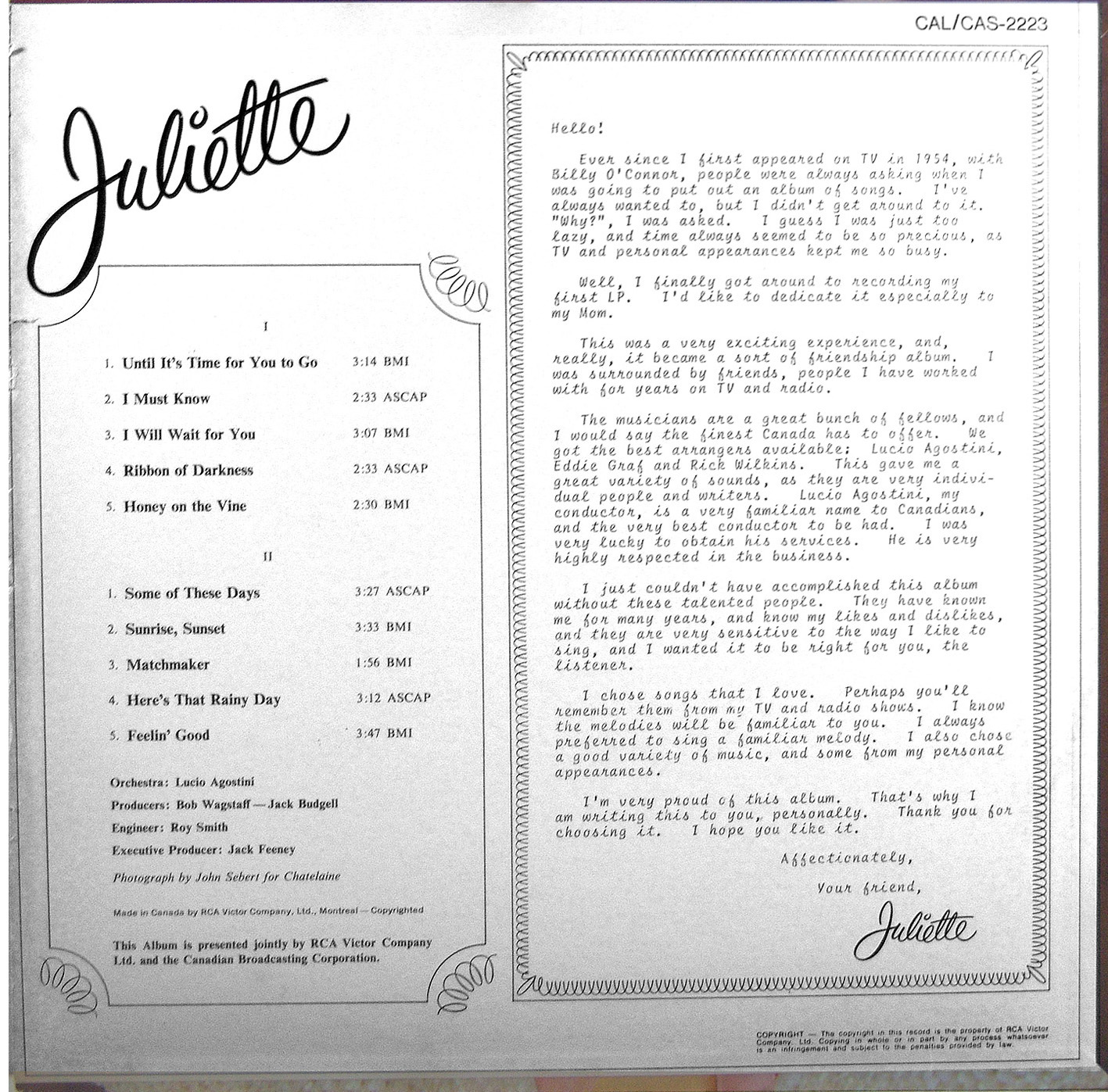 Juliette Augustina Sysak was born into a working class Polish-Ukrainian immigrant family in St-Vital (Winnipeg) in 1927 and raised in Vancouver. She was spotted and hired by bandleader Dal Richards, became a nightclub singer and had her own radio show by age 15. Moving to Toronto in 1954 with husband Tony Cavazzi to pursue a television career on the CBC, she first worked as a vocalist on The Billy O'Connor Show and soon replaced him in the same time slot with her own Juliette Show. The show ran from 1956 to 1966, an era in which having your own TV show was considered the pinnacle of success. It was without a doubt the highlight of her career. According to the CBC Archives, the show had a winning formula for early television: “A typical program would include Juliette, always showing off an exquisite new dress, performing several musical numbers solo and several with one of her male escorts and singers.” Relying on her cute demeanor, she was really a female crooner. Her hit TV show featured all the elements of the best American shows hosted by Frank Sinatra, Perry Como and Andy Williams. The show's arrangers and conductors were, successively, Bobby Gimby, Bill Isbister, and Lucio Agostini. The orchestral theme was the Sinatra hit song “Love and Marriage.” While the theme song played, announcer Gil Christie would say the famous words: “Now here's your pet ...Ju-u-liette.” She was a permanent fixture on Canadian television. Only Hockey Night in Canada and the National News had a larger audience