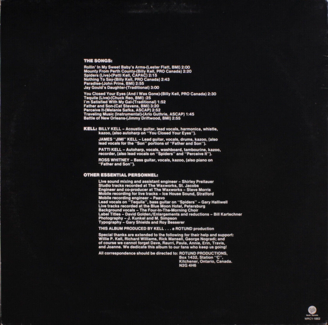 The Kells and Ross Whitney released an album together in 1981 under the name Kell entitled ‘High Energy’ featuring studio sessions done at Waxworks in St. Jacobs, Ontario plus live material from The Blue Moon in Petersburg, Ontario (featuring Gary Halliwell on bass). In the early ’90’s Billy Kell released an independent cassette called “Too Old to Quit Now”. Billy Kell succumbed to cancer July 23, 1991.