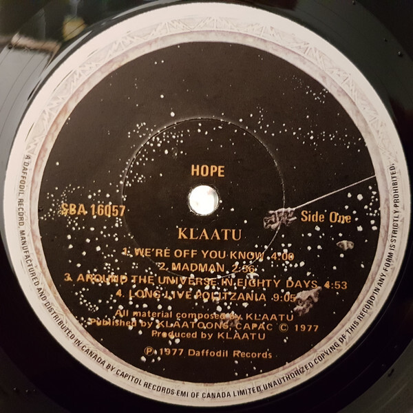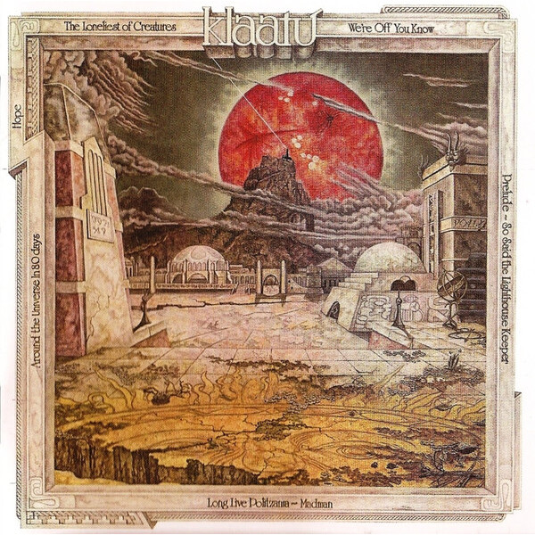 Now, hundreds of thousands of fans later, Klaatu returns with their second Capitol album, Hope, a thematically linked science fiction fantasy (Klaatu considers it the second chapter of the story begun on the first album). Hope plots the course of a group of space travelers who visit the remnants of a distant planet (the same one that blew up on the first record). They had recently discovered the asteroid due to a fine, but intense shaft of light that emanated from its surface. The fragment of planet was one of the many pieces that were hurled across the universe by the holocaust that destroyed the planet Klaatu on the first album. The bits of planet formed a huge asteroid belt which came to be known as the space graveyard. The visitors discover an ancient civilization called Politzania which also was destroyed in the explosion. Yet amidst the ruins a lighthouse beams in the night manned by the only survivor of the planet, the old lighthouse keeper. The lighthouse with its laser flare (which the visitors followed to the planet) warns interstellar travelers of the impending danger of the solar reef. The keeper of the light has spent his life searching for a philosophy, prayer, or phrase that might help bring eternal peace. Klaatu sings: "When to his end the old man came, Death told him, 'You'll not die in vain'... And had we heard his parting word, we'd know that he had said... Hope."