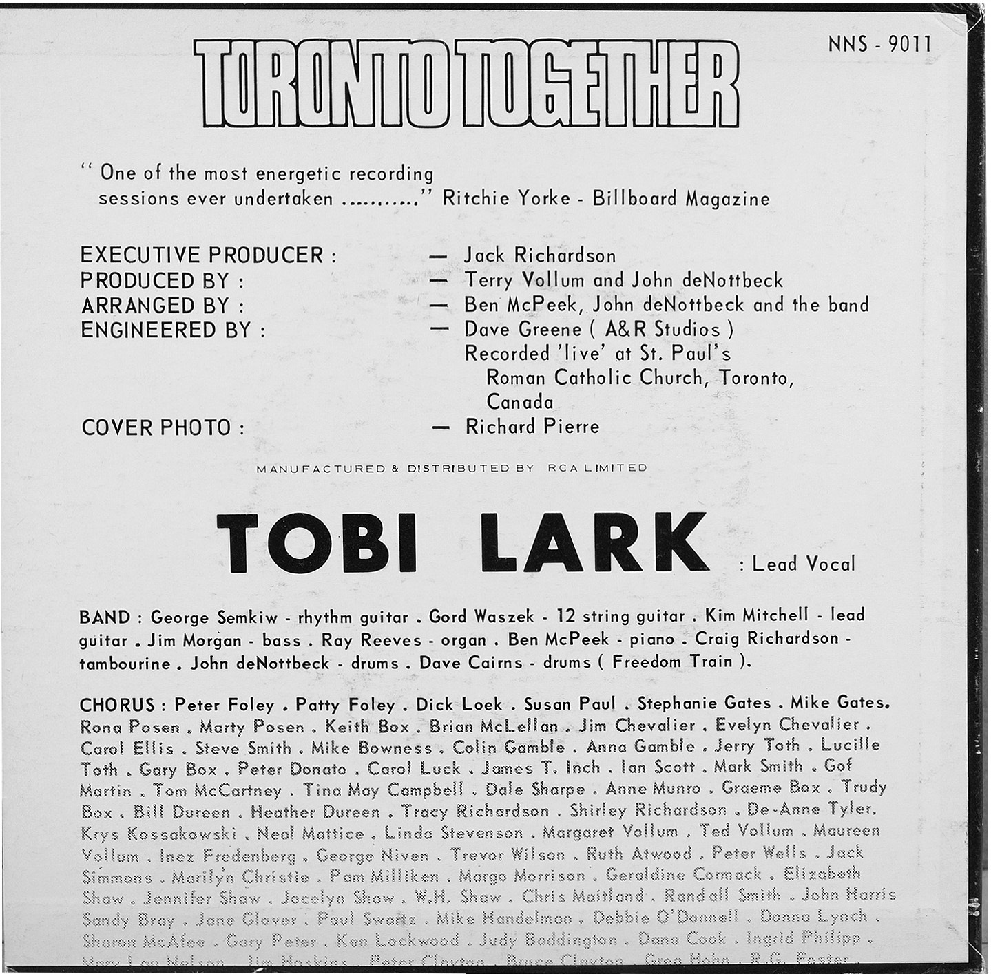 McQueen had already released the song earlier that year with his band Cat, but it had met with little success. Enter Terry Vollum and John De Nottbeck, who were billing themselves as Toronto Together and were looking for a way to cash in on the post-Woodstock vibe. And what better way than by cramming as many people as possible, along with some local musical royalty, to make a record with a universal peace-and-love message. Heading things up would be Tobi Lark, an American transplant who was currently singing one of the leads in the local production of Hair, and Dave Cairns of the fledgling group Leigh Ashford.