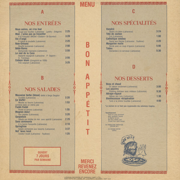 Striking out solo in 1976, Plume quickly established himself as a singular force in the Québécois music scene. Blending blues, folk, Latin, rock ’n’ roll, chanson, and spoken word, his early albums like Plume Pou Digne (1974) and Le Vieux Show Son Sale (1975) became underground landmarks. Songs like “Bobépine,” “Le Mal du pays,” and “Jonquière” struck a nerve with a generation disillusioned by mainstream media and politics. With his tangled beard, raspy delivery, and knack for vivid characters and street poetry, Plume became the voice of the anti-hero: the hitchhiker, the bum, the loner in the tavern who sees through the bullshit.