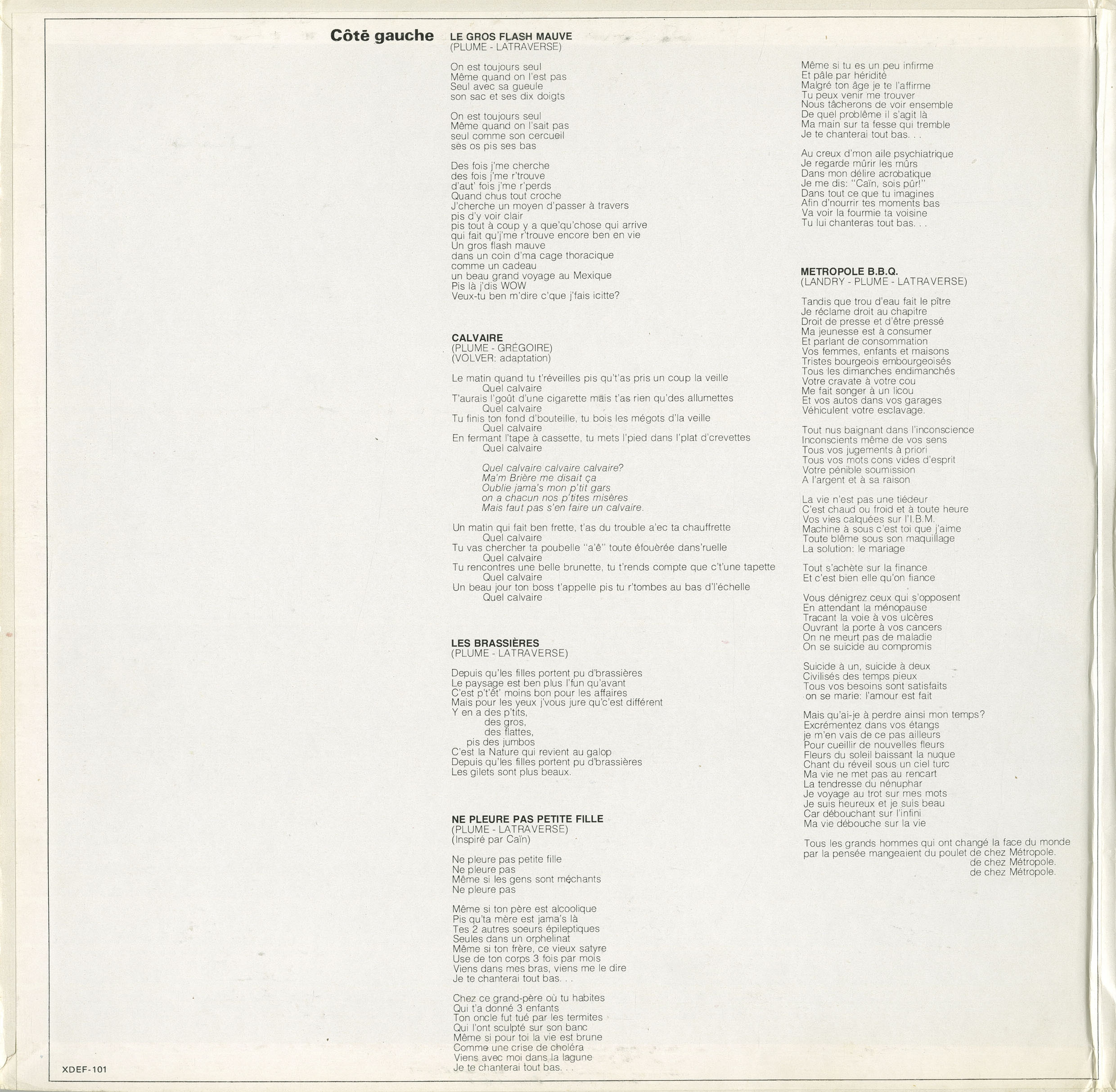 Striking out solo in 1976, Plume quickly established himself as a singular force in the Québécois music scene. Blending blues, folk, Latin, rock ’n’ roll, chanson, and spoken word, his early albums like Plume Pou Digne (1974) and Le Vieux Show Son Sale (1975) became underground landmarks. Songs like “Bobépine,” “Le Mal du pays,” and “Jonquière” struck a nerve with a generation disillusioned by mainstream media and politics. With his tangled beard, raspy delivery, and knack for vivid characters and street poetry, Plume became the voice of the anti-hero: the hitchhiker, the bum, the loner in the tavern who sees through the bullshit.