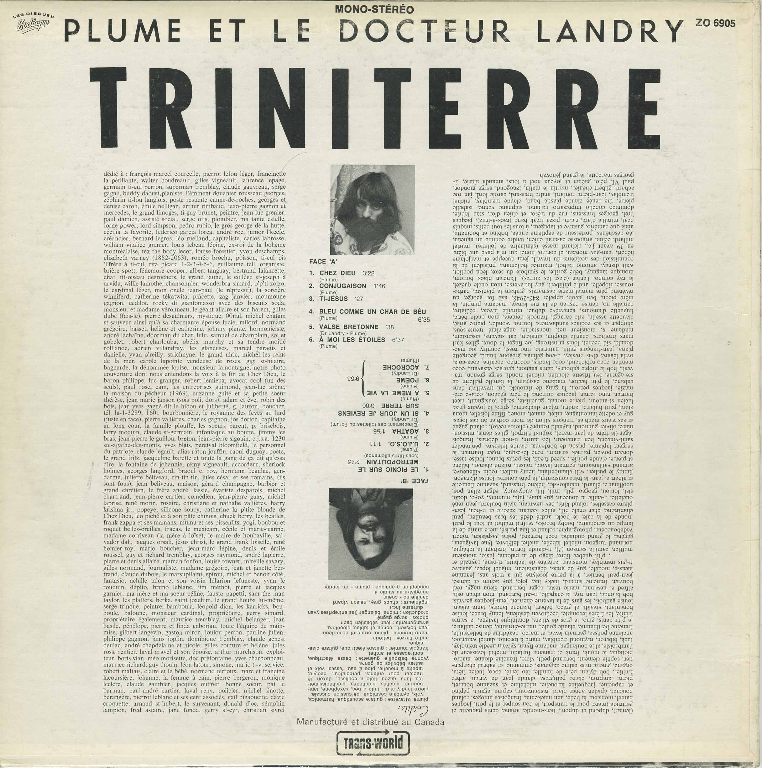(lemar), dupond et dupont, tiers-monde, ariane, denis paquet et germotte (merci pour le transport, le bon souper et le pot), jacques hamel, monsieur la belle, ann mackenna, françoises limoges, roland bouchier, épicier, gérard biard, restaurateur, angèle lafrance, pépine et cacanne, jacqueline larouche, michèline et suzanne bouerret, pierre lampron, claire pettigrew, claude jean de vrieul, arbre fruitier, bob dylan, père de famille, léo ferré, coco, léona hélù, organe, ginettes aimée d’aganis, emmanuel et gabriel charpentier, sophie clement, bernard petit, vito, francine dionne, macrobiotique le mouk, franck et francine furtado, michel levasneur de l’ambroisie, la boulangère, madame flynn, sylvain needle tremblay, tuck, bièreon, raymond tremblay, marie à toronto, daniel waterloo, ancienne polisse, germain l’evac, et marco, dexdrine de bellefeuille, francine berthiaume, claude goulet, marie-christine, denise dallaire, le p’tit denis, le gros des villas, dominique, la sainte trinité, les frères lecompte, bebeth desbiens, lenny bruce, louise bonenfant, vivaldi, el gréco, bébert, blanche landry, tante eileen, louise dadols, les gars de la taverne elric, jean-pierre gervais, bob lalonde, jean noy, la chapelle, ti-cl. bertrand, mon chien osti, alfred e. newman, mario testa, roger bertrand, elena nagy, réal bouvier, francois malard, luck, joe, jojo, guy and chantal, jean-paul bérini, à la petite jocelyne qui a trois ans, jeannine lacasse, modelay du gras, dégustateur, miguel lopez, gustave ti-gus tremblay, monsieur livreur de lachat, ti-rené, raynald et ariane, p’tit obèse libre, diego de la palma, juste, monsieur muffler, camille samson (?), ti-claude fortin, brabant le technque, normand turgeon, michel labelle, michel lefebvre, lye lavigueur, séguin le grand duduche, robin bernard, poète gaspésien, robert vadeboncoeur, duduphoric, rond de la paris, mère marie de la lampe du sanctuaire, bobby brooks, wilfrid méthot et tout le petit monde de la cale, le bock, andré côté les bras beaulé, paul chantara et cie, oncle bilk, gilles fezetta, zézette et ti-bleu, jean-pierre cassels, roland kirk, bev newman, alain bouldar, jean-réné ouellette, ti-caille la douceur, guy, guy, juju, mummy, yoyo, dodo, sisi, loulou, geogo, pili, miki, hili, audy-audy, edgar allan poe, mishmash et lola, miakowski, hélène brassard, suzanne d’argou, et albert le jean, la fère constantin, le père couteur, louise d’aragon, jimmy le pusher, wilt chamberlain, henry miller, robin villeneuve, armand vaillancourt, germain lavioe, roussil, roland chanel, hélène st-pierre, claude poirier, speed freak, les petits bruno, louise isaac, doreen power, patrick strram, rené lévesque, roger fournier, le sergent laplante, prison de bordeaux, claudette lefebvre, pénitencier saint-vincent, ben franconie, léo laurin, ti-noir débrais, françois léger (lire léger de jean-marc), kojikiff filtoplis, gilles desrosiers, niaise, olivier gumbel, raynald rompré (photos recto), roland gagné et ses vieux mulets, françois villon de mont rcrieir ou des loges, guy et odette lamontagne, milet, manet, mont, finie loiselle, mona streen, p’tit bulaire, landur, réjean duchame, spire, le joyeux grec, lutter si-amour, pierre monart, gauchiste, serge tissonnant, ricet barriet, ninon ferrer, jacques dutone, le père gedouin, oewtre crémazie, jacques perron, la gang de rimouski qui travaillait dans sa cabane, le p’tit hector, madame casgrain, la famille pretlier de st-ephate, feu mister cloutier, micheri mondi, serge granon, trost, web, le hippie badoury, eins, gangon, georges casavant, coco meric, coco robichaud, coco landry, coco cocaine, coca-cola, ovila léger, elvis presley, ti-coco gédinas, grégoire huard, georgette laplante, grands fruits, attitude, fin rossi, country joe macdonald, sid bechet, louis armstrong, joe fine d’oux, gilles karl marx brothers, charlie chaplin, einstein, cat stevens, einsemann, madame x, monsieur net, moustache, ange-étrenne-tous, chopper et ses zodiac sundowners, wonder, pierre séguin, claudette asselin, éric caranaj, françois dermers, mon oncle béric, huppé d’amours, geneviève dubé, mireille lavoie, pédartre, danielle m., denise bastien de la rue lemay, madame pimpin, la mère pion, ben jacob, appelbar 245-2948, kat bro george, au révérend père michel marie desmarais, graham le pianiste, barbac, rousse, ribelle, andré philbert, guy latraverse, mon oncle quézel, le royal con, (fermé les autres), francis leblanc bottom, monique, yvan, tout le reste, le symbolique du cèdre et potlotek, walt disney, antonio taboti, maurice bellemare, président de la législation des auditoires, le frère jules, abbé de marloiane hebert, jean guy croteau (tient mon cig à moitié pleine), ben 39, anat-jc, richard massé (séminaire de joliette), urmel millard, gil vachon, serge et carl, line et plume, ben ameuro, léo deschênes, professeur de septième année, bonibo et bobinette, qui ceu aimera, suivra et tu paieras tous les bouts-petits, maquis beat, militaire, gilles du 7e régiment (rack-a-rack), jacques berri, georges brassens, rue du trésor et son décor, s’am labrie, ginette cobello immigrée italienne, shanghaienne isabelle pierre le tricheur, marie-paule blanchet, claudia, louise tremblay, jean-pierre ronfard, m brassaud, carole lord, jac richard, gilbert chénier, martin st-laurent, ben trudeau, mon papa paul VI. pélo, gâtant et joyeux noël à tous, amanda alarie, ti-georges marcotte, le grand jéhovah.