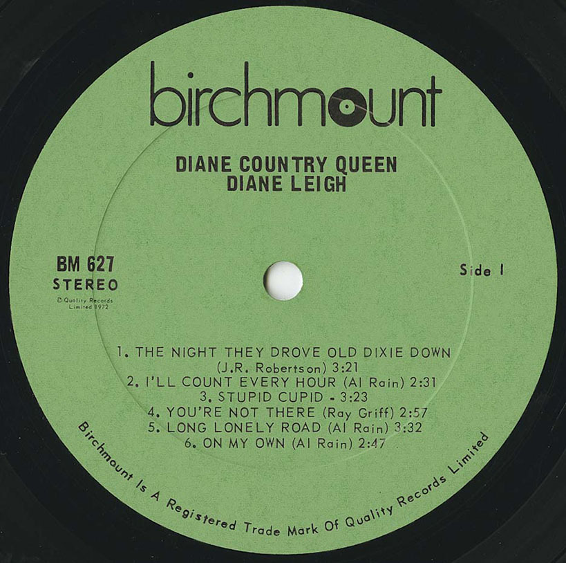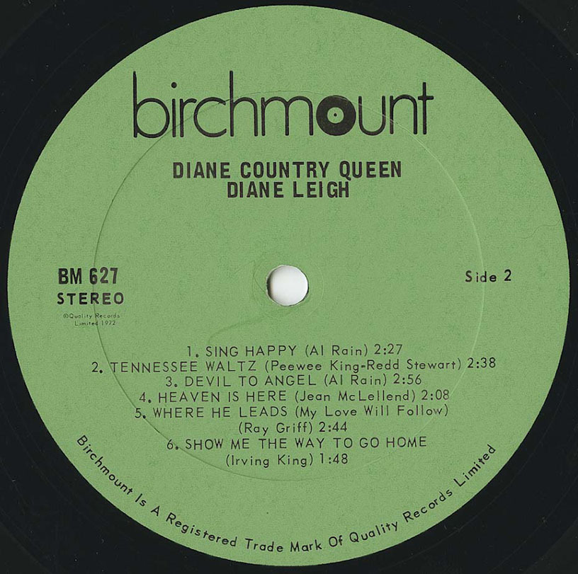 Diane Leigh, the "Queen of Canada's Country Music", earned her crown by winning the RPM Gold Leaf Award five times, as Canada's Top Female Country Singer, from 1965 to 1969! During this period, Diane won the hearts of Country fans across Canada as a regular on the top rated TV show, Carl Smith's Country Music Hall. In 1971 Diane guest starred for nine weeks on the Country Show over CBC Halifax, CBC Toronto, and CHCH Hamilton. Most of Diane's early recordings were chart makers–"Two Shades Of Blue", "Woman And Man", "The Wife You Save", "Me Your Own", and others.
