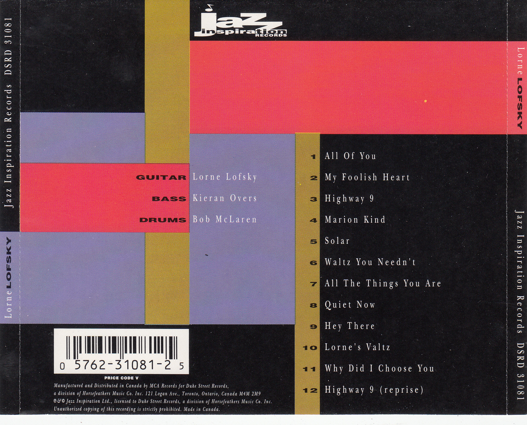 Guitarist Lorne Lofsky’s first album for the Jazz Inspiration label, and his first recording as a leader in 11 years, finds him in a much different state of development than on his prior Pablo release. Gone are the blues-influenced phrases, and the direct resemblance to fellow Canadian guitarist Ed Bickert (although Bickert’s presence is still evident in the advanced chordal playing of Lofsky’s music). What remains is a very aggressive, harmonically and rhythmically sophisticated player whose unique guitar style bears a striking resemblance to Bill Evans. The Evans influence is everywhere on this recording, from the choice of material (“All of You,” “My Foolish Heart,” “Solar,” and “Quiet Now” were all part of Evans’ repertoire), to the tracks which feature Lofsky overdubbing multiple guitars, a procedure Evans employed on several records. The trio is at its’ most furious on the title track, and on “All the Things You Are”; Lofsky constantly altering and displacing the harmonic movement of the tunes, while drummer Bob McLaren aggressively sets up false cadences and climaxes, disguising the form of the music. Solos by bassist Kieran Overs are often used by Lofsky as a means of further interaction, eschewing traditional chordal accompaniment, in favor of short phrases in response to the bassist’s lines (another trademark of Bill Evans). The rest of the album is somewhat lower key, although the music is always highly interactive and interesting. This is not a record for everyone; some may find Lofsky’s playing overbearing. For fans of the style, though, this comes highly reccommended.