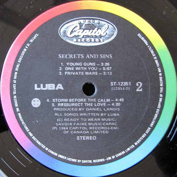 Secrets And Sins is the first full length album on Capitol-EMI of Canada by Canadian singer, Luba and band. Produced by Daniel Lanois, this breakout album won Luba Juno Awards for "Best Female Vocalist" and "Female Vocalist of the Year" in 1985. Included is the calypso-reggae style hit single "Let It Go," later featured on the motion picture soundtrack for 9 1/2 Weeks. Other popular singles include "Secrets And Sins," "Storm Before The Calm" and the remake of "Everytime I See Your Picture."