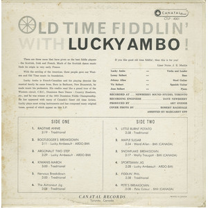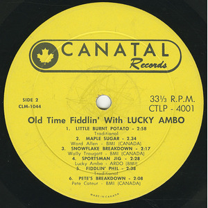 Lucky Ambo (Ambeault) is French-Canadian and his playing denotes the musical family he came from. Born in Bathurst, New Brunswick, he made music his profession. His credits read like a grand tour of the Western circuit. CBC, Dominion Barn Dance, Country Hoedown, etc., and he was winner of the 1955 Dominion Fiddle Championship. He has appeared with many of Canada’s finest old time artists. Lucky plays most string instruments and has composed many original tunes, several of which appear on this LP.