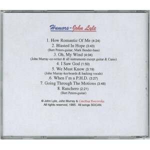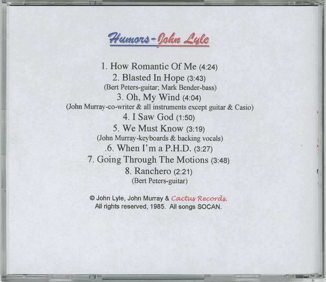John returned to his home in the Vancouver area, and devoted himself to his family, supporting them with a career that may have been more dangerous than the performance stage. He became a postman. John Lyle’s wonderful body of work is evidence of a life lived on the streets and in the home, filled with all the love and loss and joy and despair that are part and parcel of being alive. The songs are vital, not written to imitate a commercial trend or to fulfill a contract, but to reflect the intensity of experience and to remain sane..........