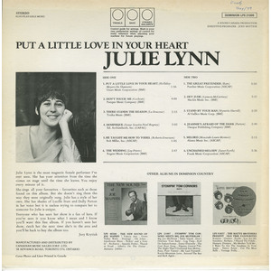 The Julie Lynn Show toured Canada for a number of years until Julie signed a contract with Dominion Records in 1970. Her debut album, "Put A Little Love In Your Heart", was released that same year. The followup, "Look What They’ve Done To My Song", (1971), produced Julie’s biggest hit, "Good Morning World" (#2 on the RPM Chart). Five other albums followed, including her final release, "The Many Moods Of Julie Lynn" (1980), a project that was recorded in Nashville with producers Lonnie Salazar and Joe Bob Barnhill.