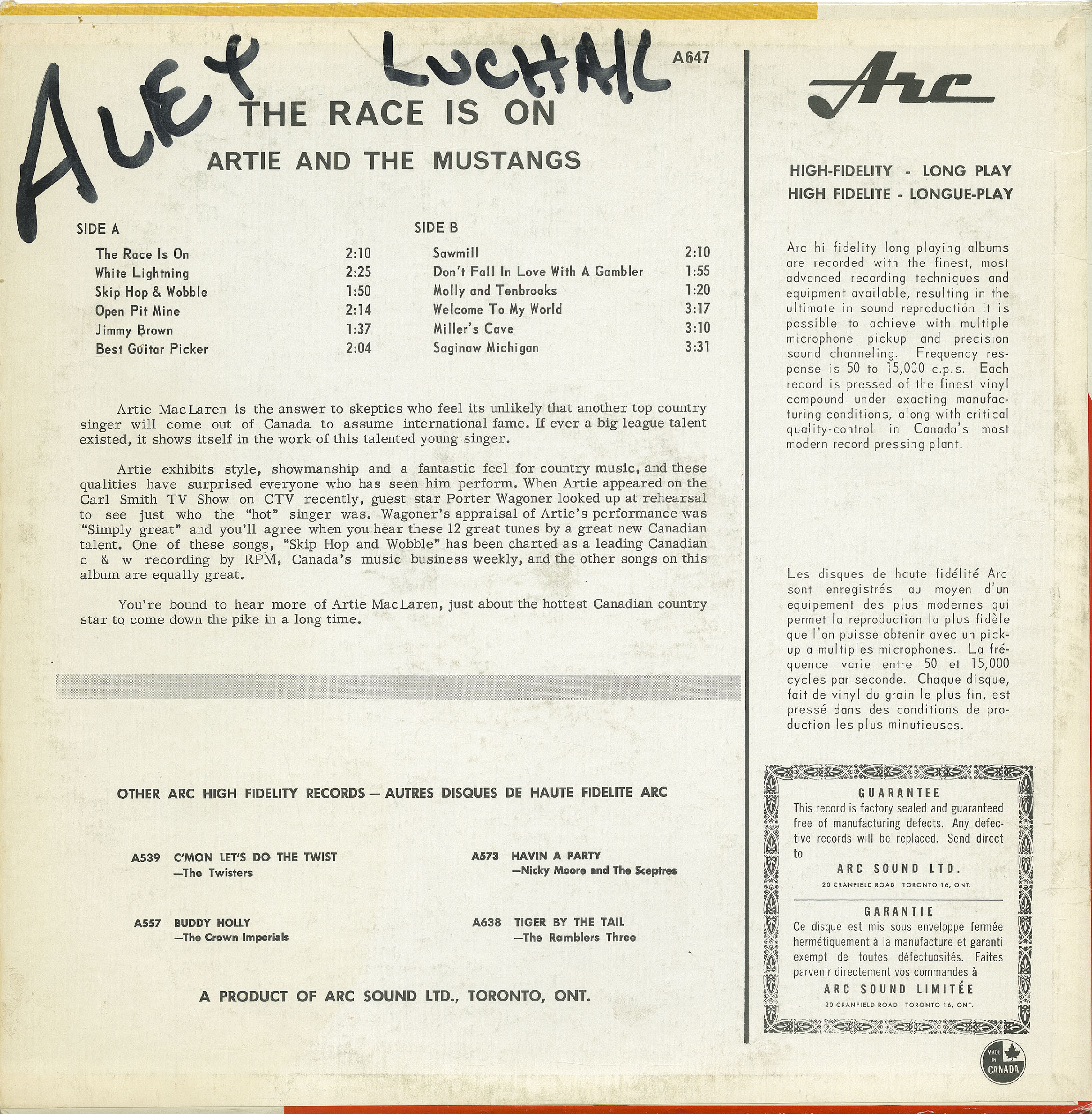 "Artie MacLaren is the answer to skeptics who feel it's unlikely that another top country singer will come out of Canada to assume international fame. If ever a big league talent existed, it shows itself in the work of this talented young singer. Artie exhibits style, showmanship and a fantastic feel for country music, and these qualities have surprised everyone who has seen him perform. When Artie appeared on the Carl Smith TV show on CTV recently, guest star Porter Wagoner looked up a rehearsal to see just who the "hot" singer was. Wagoner's appraisal of Artie's performance was "Simply great" and you'll agree when you hear these 12 great tunes by a great new Canadian talent. One of these songs, "Skip Hop and Wobble" has been charted as a leading Canadian C&W by RPM, Canada's music business weekly, and the other songs on this album are equally great. You're bound to hear more of Artie MacLaren, just about the hottest Canadian country star to come down the pike for a long time."