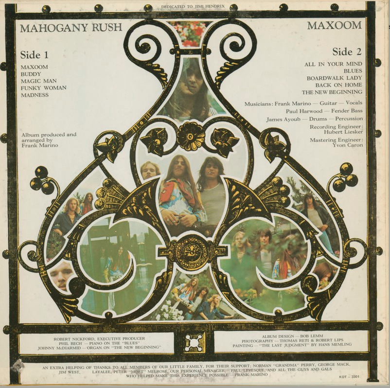 Since Frank did pay tribute to Jimi Hendrix by "Dedicating" this first Mahogany Rush LP. It only seems fair to say that if Jimi did have a conversation with Frank he would no doubt have said to him "Frank, my whole life I wish I could have put together a band and recorded an album as tight and diverse as you did." MAXOOM Stands on it's own as an lp. Nothing like it has ever been done before or since. From Rock, Jazz, Blues and all points in between. The first song BUDDY is a testimonial to a soul brother who touched a life, then passed away. And you want to live to make him proud of you. Going through a song by song review is fruitless.