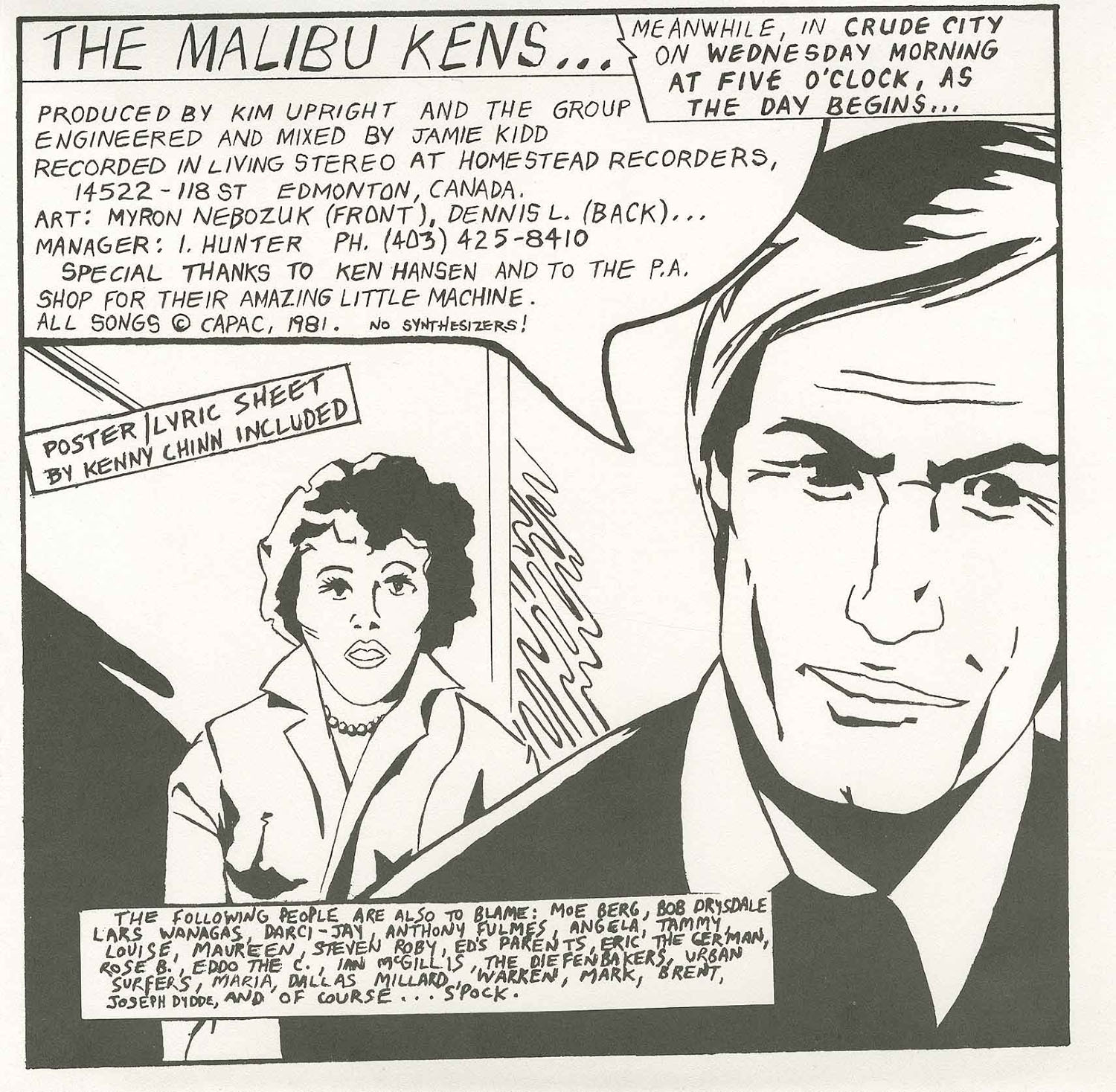 In 1981, the Malibu Kens released one of Edmonton's earliest independent punk singles, featuring "Crude City" and "Wednesday Morning at 5 O'Clock (As the Day Begins...)" on the Exploding Debut label. The single was co-produced by the band and Kim Upright of the Modern Minds, who later co-founded Jr. Gone Wild with Mike McDonald. The insert for the single was designed by Ken Chinn, also known as Mr. Chi Pig, who would later gain fame with SNFU.