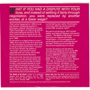 But we’re not giving up. We’ll picket, leaflet, and boycott Gainers until we win justice. The Battle of 66 Street is more than just our dispute with Peter Pocklington — it’s a struggle for all working people who want dignity and fairness. Thank you for buying this record and supporting our cause.