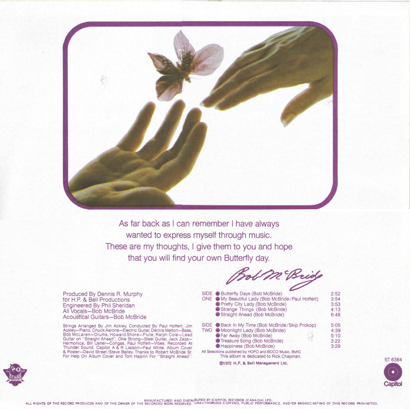 Written by Bob Mcbride except 'My Beautiful Lady' written by Bob McBride and Paul Hoffert; and 'Back in My Time written by Bob McBride and Skip Prokop