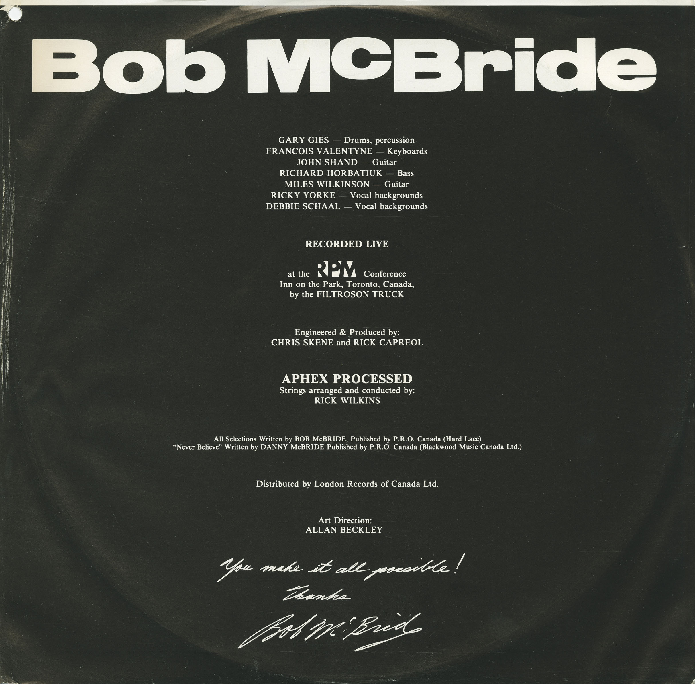 After several years of limited activity, McBride signed with MCA Records and released his third solo album, Here to Sing (1978), featuring arrangements by Paul Hoffert and production by Jack Richardson. Despite strong musicianship” the album failed to chart. He followed it with a self-titled live album, Bob McBride (1979), recorded at the RPM Conference at Toronto’s Inn on the Park and released on Aurora Meadows Productions.