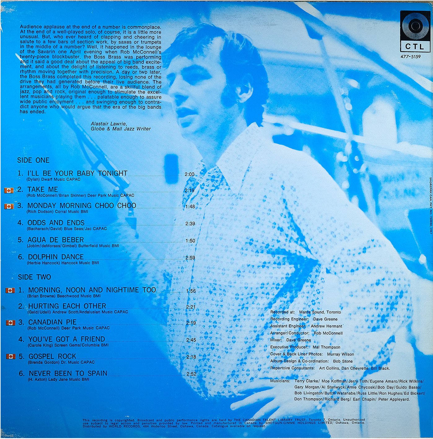 That vision became reality in 1968 with the birth of The Boss Brass, a sixteen-piece ensemble of Toronto’s finest studio musicians. The group’s sound was bold and unmistakable: four trumpets, four trombones, a pair of French horns, and a rhythm section, with no saxophones at first. In 1970 McConnell added a full woodwind section, and by 1976 the band had grown to twenty-two members. The result was a powerhouse outfit that set a new standard for big band music in Canada.