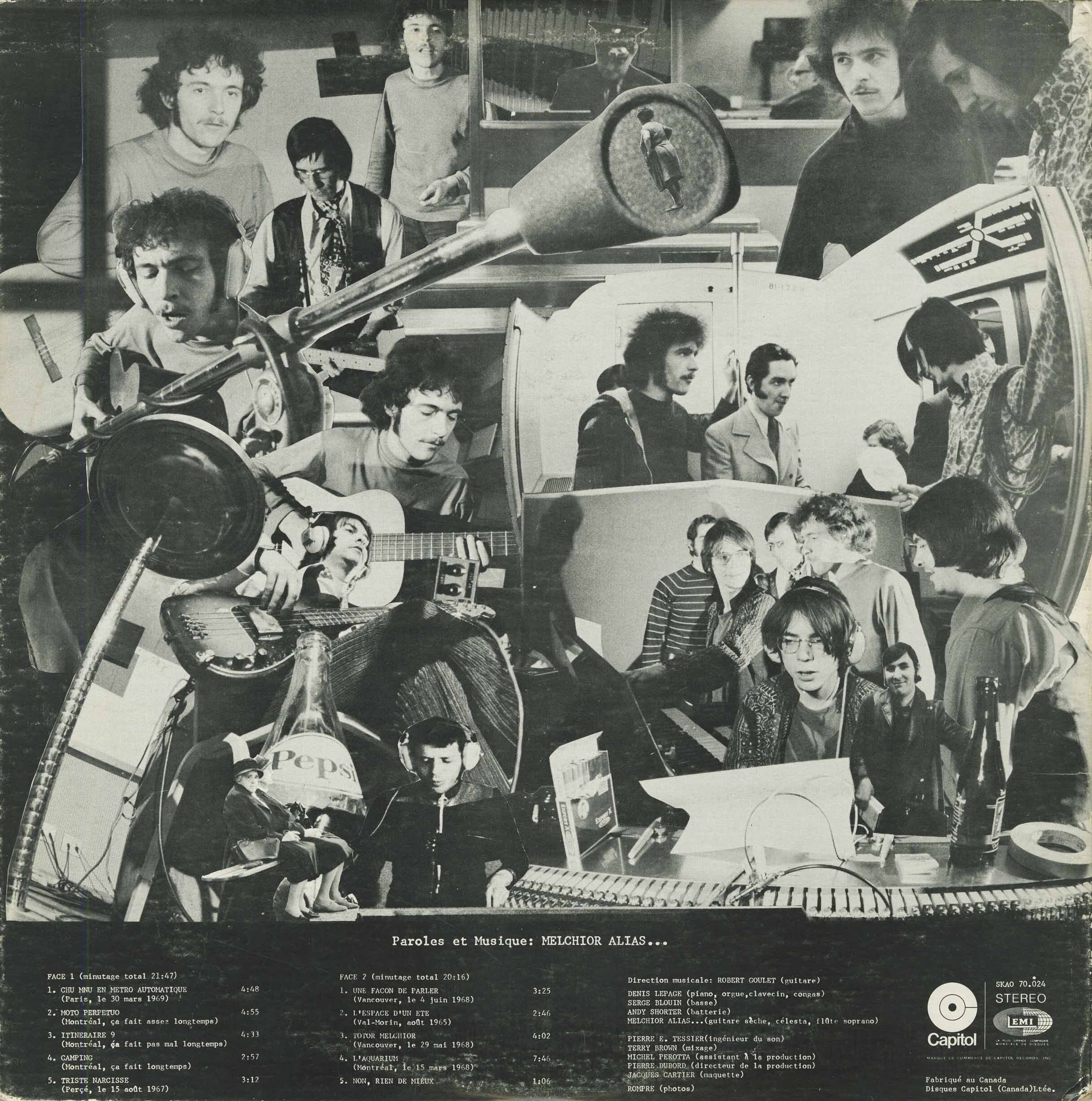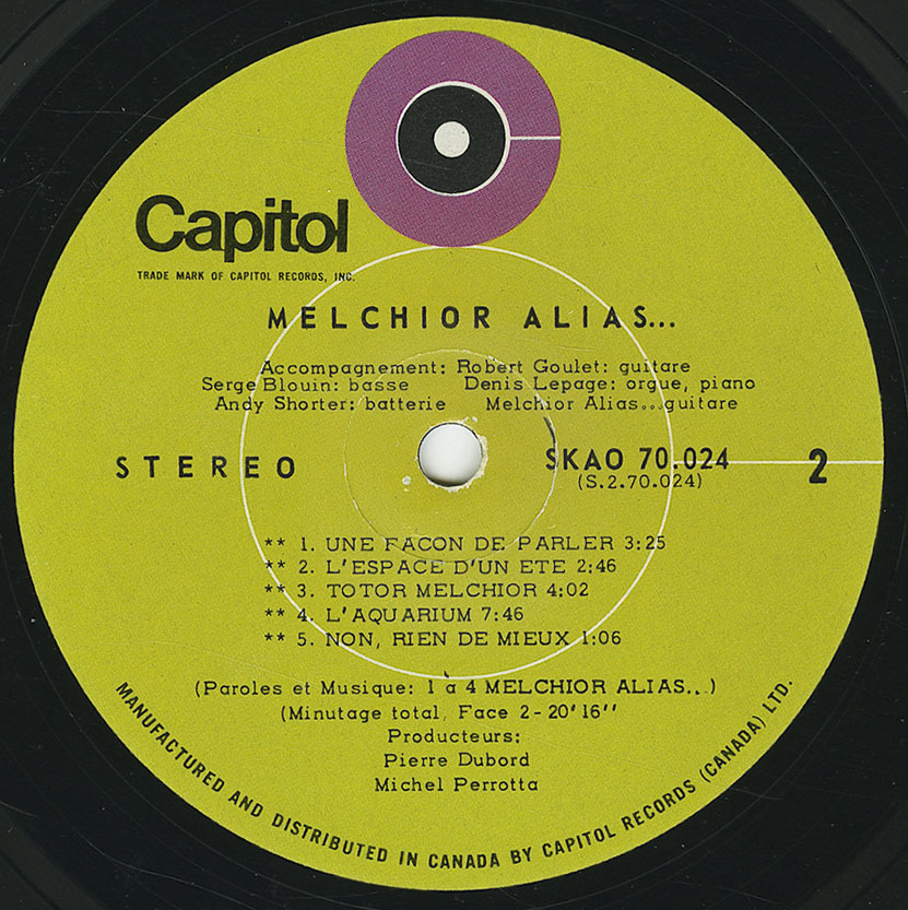 This French-Canadian ultra-rarity makes its long-overdue CD debut here. Originally issued in 1969, it's a crazed blend of catchy pop, funky grooves and spaced-out psychedelia, with plenty of acid guitar. The identity of the enigmatic Melchior Alias remains unknown, but numerous leading lights of Quebec's progressive music scene are involved, including arranger and future disco luminary Denis Lepage and engineer Peter Tessier (later to make his own rare album). It seems likely that the credit for Robert Goulet as musical director is a joke -- but anything seems possible on this most strange and mysterious of discs. "From Quebec and sung in French, this goofy fusion of guitar, organ, drums and mild electronics has an amiable air of stoned experimentalism ... the highlights are the bizarre groover 'Itineraire 9,' laid-back ballad 'L'Espace d'un Été' and spacey 'L'Aquarium,' which recall the more experimental work of Michel Polnareff and Serge Gainsbourg. Two 45s were extracted, and quite a lot of effort went into the packaging, but promotion and distribution must have been poor, as it's easily one of the rarest major label albums of the period."