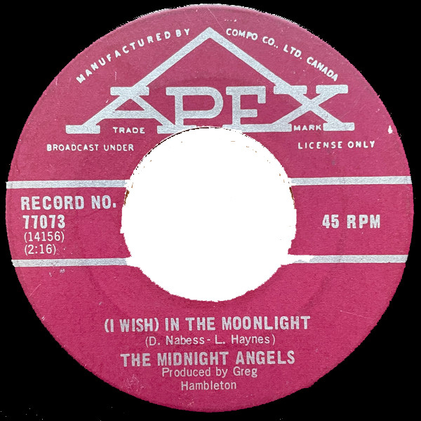 From The Pas, Manitoba, the 60’s rockabilly band The Midnight Angels are featured here with four rare tracks. The original musicians on the recording sessions at Toronto’s Sound Canada Recording Centre in 1967 are Lary Haynes, vocals and bass; Don Nabess, rhythmn guitar and vocals; Charles Nabess, lead guitar and vocals with Jim Moran on drums. After the session, Bill Allard replaced Jim on drums when they toured. Their first single was “I’m Sufferin’” b/w “(I Wish) In The Moonlight” released on the Apex label in early 1969 with local success in Dauphin (#4 on CKDN), Winnipeg and throughout the Western provinces where they toured.