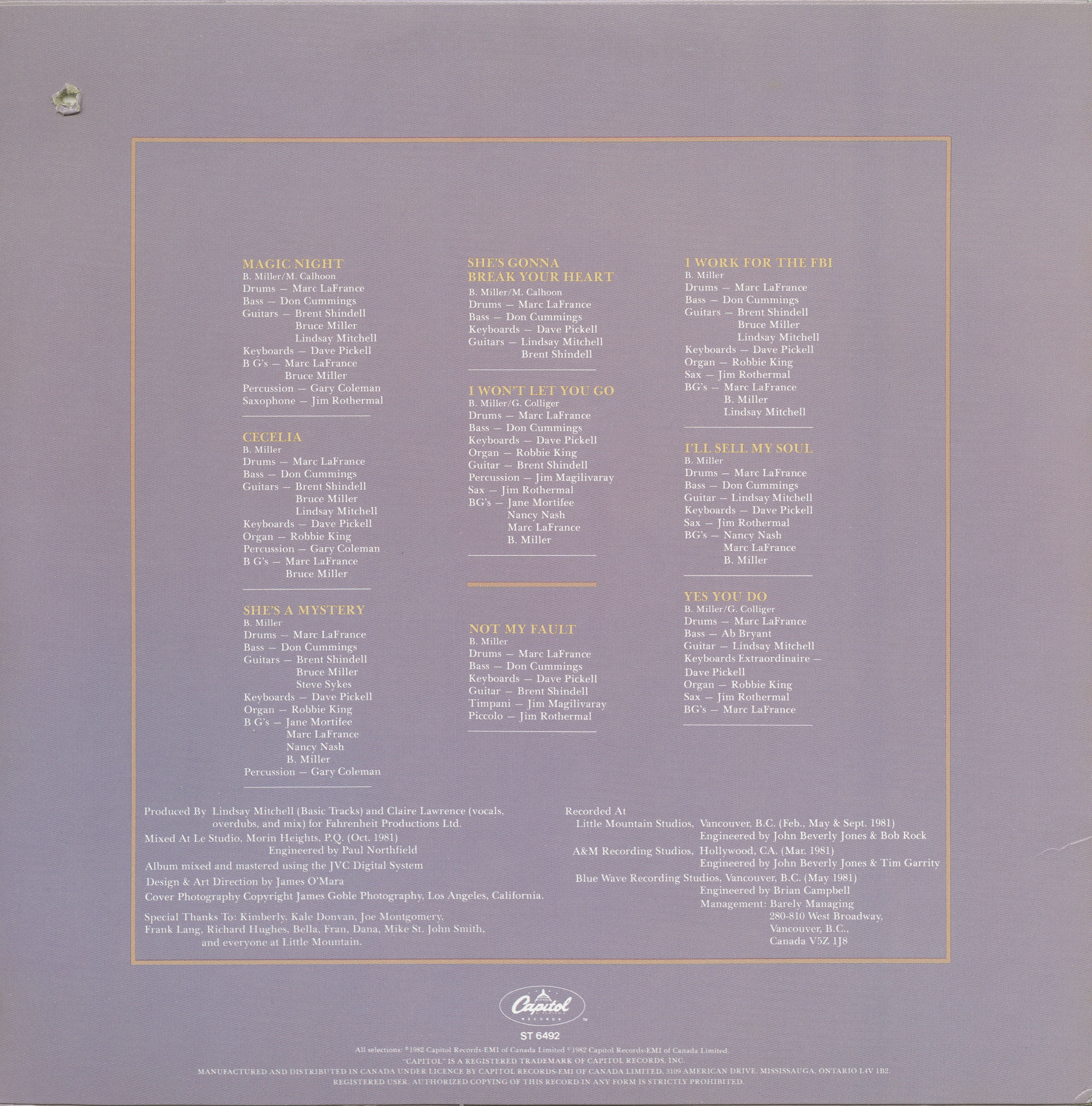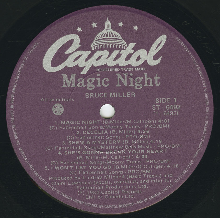 In 1982, Miller released Magic Night, an album that continued to highlight his songwriting and musical versatility. The record featured a roster of accomplished Canadian musicians, including Marc LaFrance (drums, backing vocals), Don Cummings (bass), Brent Shindell, Lindsay Mitchell, and Bruce Miller himself on guitars, Dave Pickell (keyboards), Robbie King (organ), and Jim Rothermel (saxophone, piccolo flute). The album was produced by Claire Lawrence and Lindsay Mitchell, engineered by Bob Rock, Brian Campbell, Beverly and John Beverly Jones, Paul Northfield, and Tim Garrity, and recorded at Little Mountain Sound Studios, A&M Studios, and Blue Wave Recording Studios. It was mixed at Le Studio.