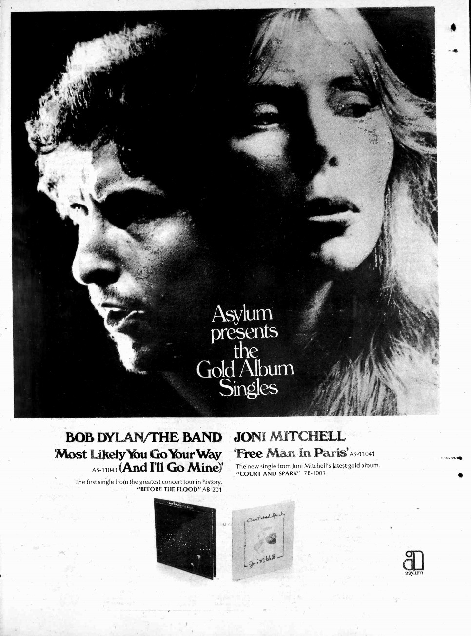 "Help Me", one of the album's singles and a Top 10 hit for Mitchell- her only such achievement - still surprises in the way it walks through various moments from the inside of a relationship, multi-faceted in its understanding of love's domain. By the end of the song, Mitchell's acknowledging the tempestuous nature of the romantic contract - "Both of us flirting around/ Flirting and flirting/Hurting too" - and hymning, elegiacally, the inevitable fall into love: "Are you going to let me go there by myself/That's such a lonely thing to do". In contrast, "Free Man In Paris" is one of Mitchell's more playful, observational songs: written about David Geffen, whose label she was signed to and whose house she shared for some time, it paints a wistful picture of an industry mover reminiscing over wasted time on the Champs Elysees, before sighing about their return to work a day reality, "stoking the starmaker machinery behind the popular song".