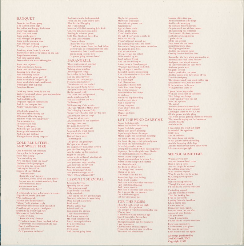 The weeping reed fills that interlace the song come from Tommy Scott and are superb, their airy swirling blending with Joni's imagery like the best of jazz, like Dolphy wailing his heart out on "Melba" or "17 West." But for the fear and degradation of the lyric this could be the most lissome and trenchant love song on the album, so lovely is the tune and so sensual the singing. But then, who says that love in a strange form is not what heroin is all about?