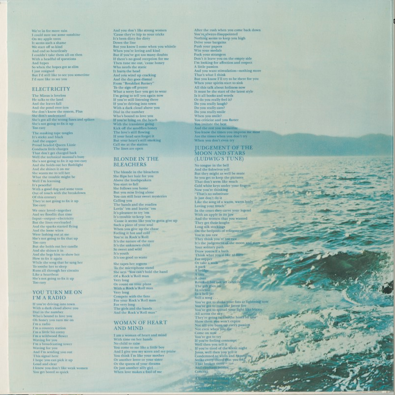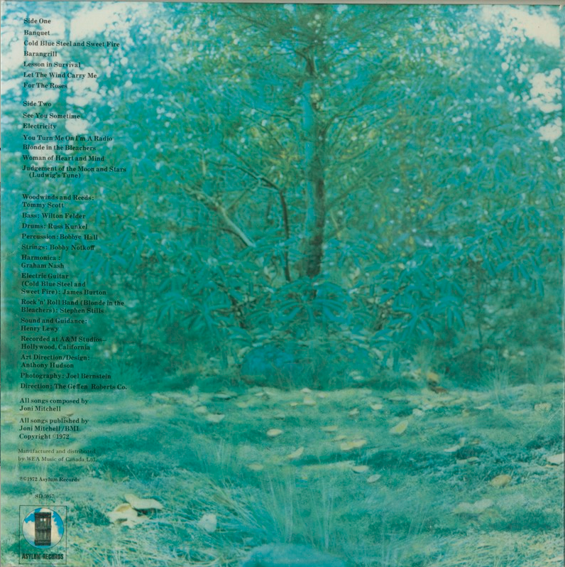 "You Turn Me On I'm a Radio" is simply stone great—she's a radio both figuratively and literally. No-nonsense lines about What's Up between two people, an example of her rollicking and rarely used humor, a rock & roll ditty that is a breath of sea air in her occasionally Dickinsonian parlor. "Blonde in the Bleachers" follows, with a wistful and resigned voice longing for a security it knows it can't have. "You can't hold the hand of a rock & roll man—very long." It's the sum of all those teasing photos, the rumors, the gossip. She sounds wise, but miserable. Stephen Stills plays a pretty coda on guitar and the song, like the title cut, seems to be one of the major emotional messages that she's trying to get across.