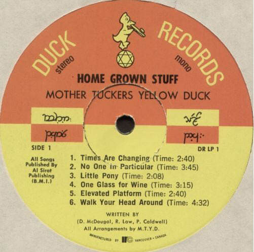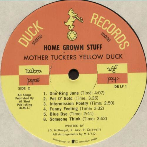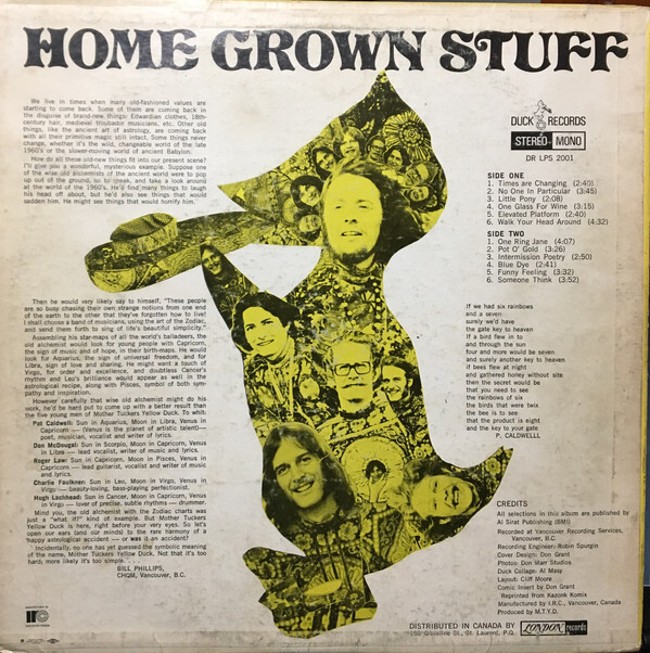 West Coast quintet Mother Tucker's Yellow Duck was formed in 1967 - not as a group of musicians but as a collective consisting of Kathy Kay from Boston who was the original Mother Tucker, John Patrick Caldwell as The Yellow Duck (aka Raphael Red The Village Idiot), Bob O'Connor (aka Dogan Pink Foot/Sheldon O'Dogan), and Michael Goldman (aka Garnet Crystalman).