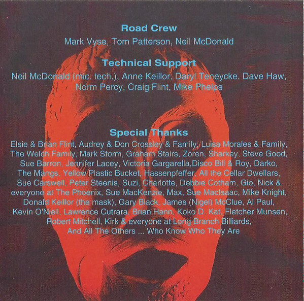 Elsie & Brian Flint, Audrey & Don Crossley & Family, Luisa Morales & Family, The Welch Family, Mark Storm, Graham Stairs, Zoren, Sharkey, Steve Good, Sue Barron, Jennifer Lacey, Victoria Gargarella, Disco Bill & Roy, Darko, The Mangs, Yellow Plastic Bucket, Hassenpfeffer, All the Cellar Dwellars, Sue Carswell, Peter Steenis, Suzi, Charlotte, Debbie Cotham, Gio, Nick & everyone at The Phoenix, Sue MacKenzie, Max, Sue MacIsaac, Mike Knight, Donald Keillor (the mask), Gary Black, James (Nigel) McClue, Al Paul, Kevin O’Neill, Lawrence Cutrara, Brian Hann, Koko D. Kat, Fletcher Munsen, Robert Mitchell, Kirk & everyone at Long Branch Billiards,