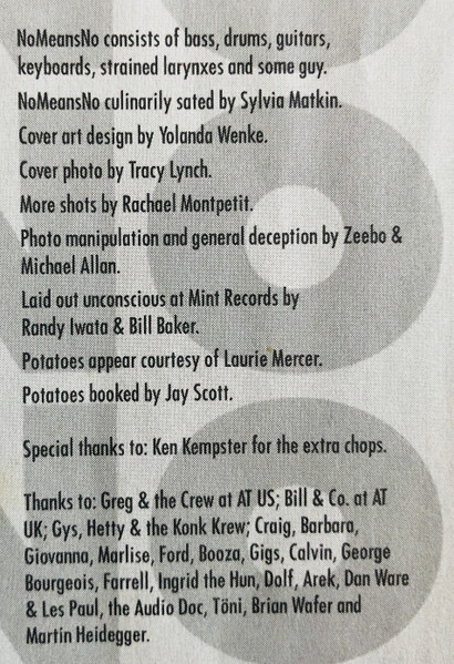The biggest change, though, is that NoMeansNo seem to be having fun again. The word I keep thinking is "exuberance." There's probably more energy in this CD than in the band's last three or four combined. Bassist Rob Wright, the most prominent vocalist this time out, seems hardly able to contain himself, like the proverbial kid in a good used CD store. When he snarls, it's scary, and when he bellows in the way only he can, you can hear the massive grin that often contorts his face when he plays.