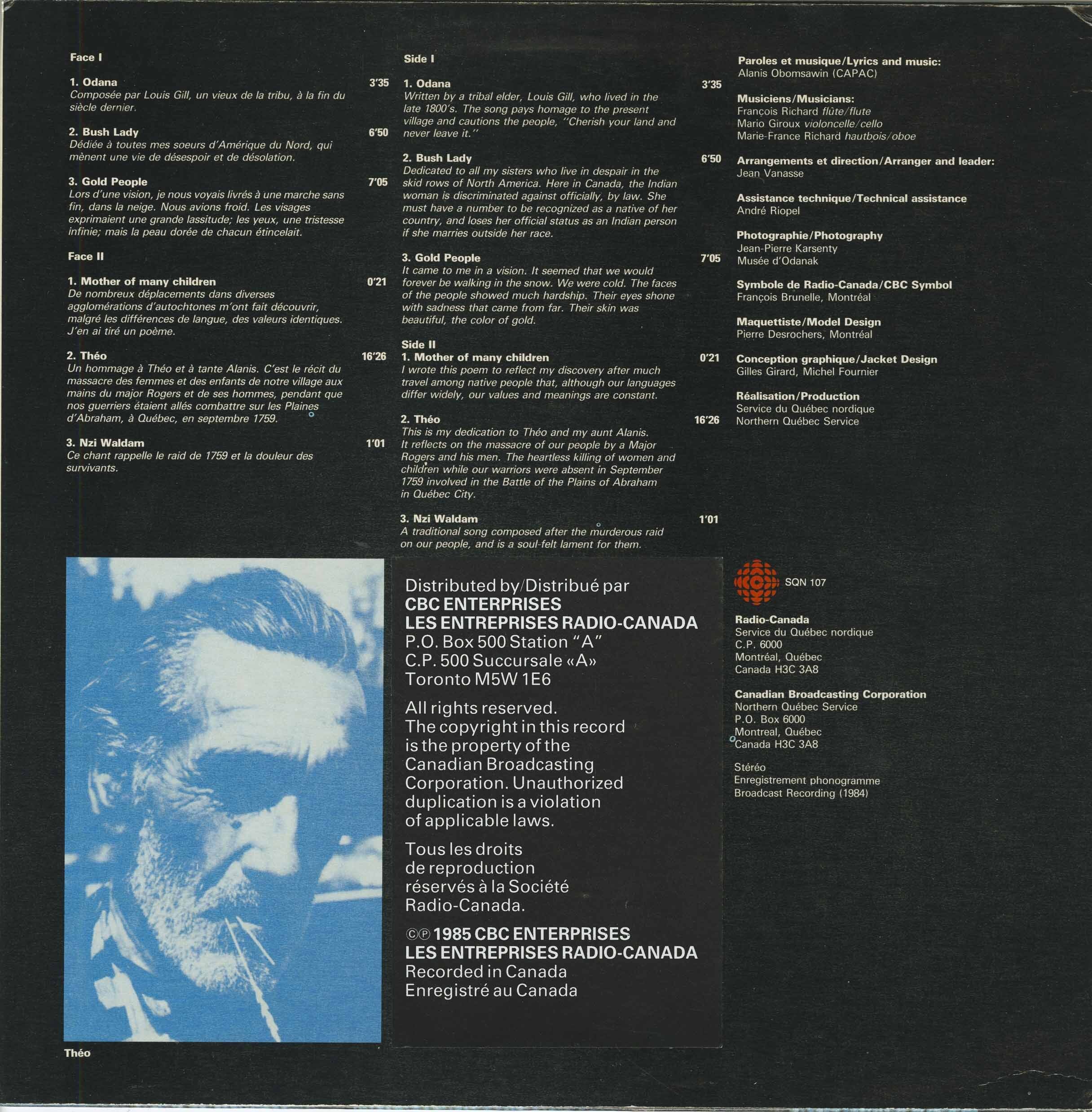 As a singer/songwriter, Obomsawin has toured Canada, the United States and Europe performing for humanitarian causes in niversities, museums, prisons and art centres, as well as at folk art festivals. Her 1988 album Bush Lady features traditional songs of the Abenaki